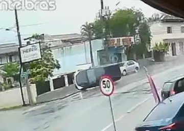 Imagens de câmeras de segurança de estabelecimentos comerciais na região do bairro Steffen registraram o momento em que um carro capota após colidir contra outro veículo que estava estacionado ao lado da via. O acidente ocorreu por volta das 15h32, na rua Blumenau.