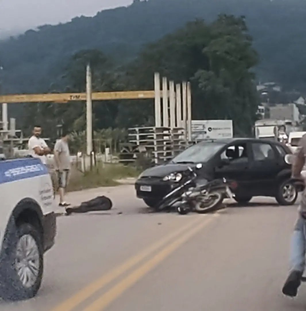 Duas pessoas ficaram feridas após baterem de moto contra um carro. O acidente foi por volta de 7h desta segunda-feira (11), na Rua Luiz Gonzaga Werner, no bairro Santa Terezinha, em Brusque.