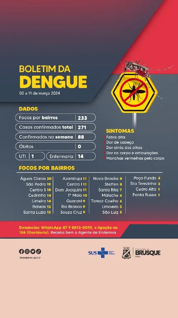 A Diretoria de Vigilância em Saúde de Brusque, por meio do Programa de Combate a Endemias, também informa o número de telefone para denúncias, pelo WhatsApp, somente em formato de texto no (47) 98813-0095, ou por ligação, no número 156, da Ouvidoria Municipal.