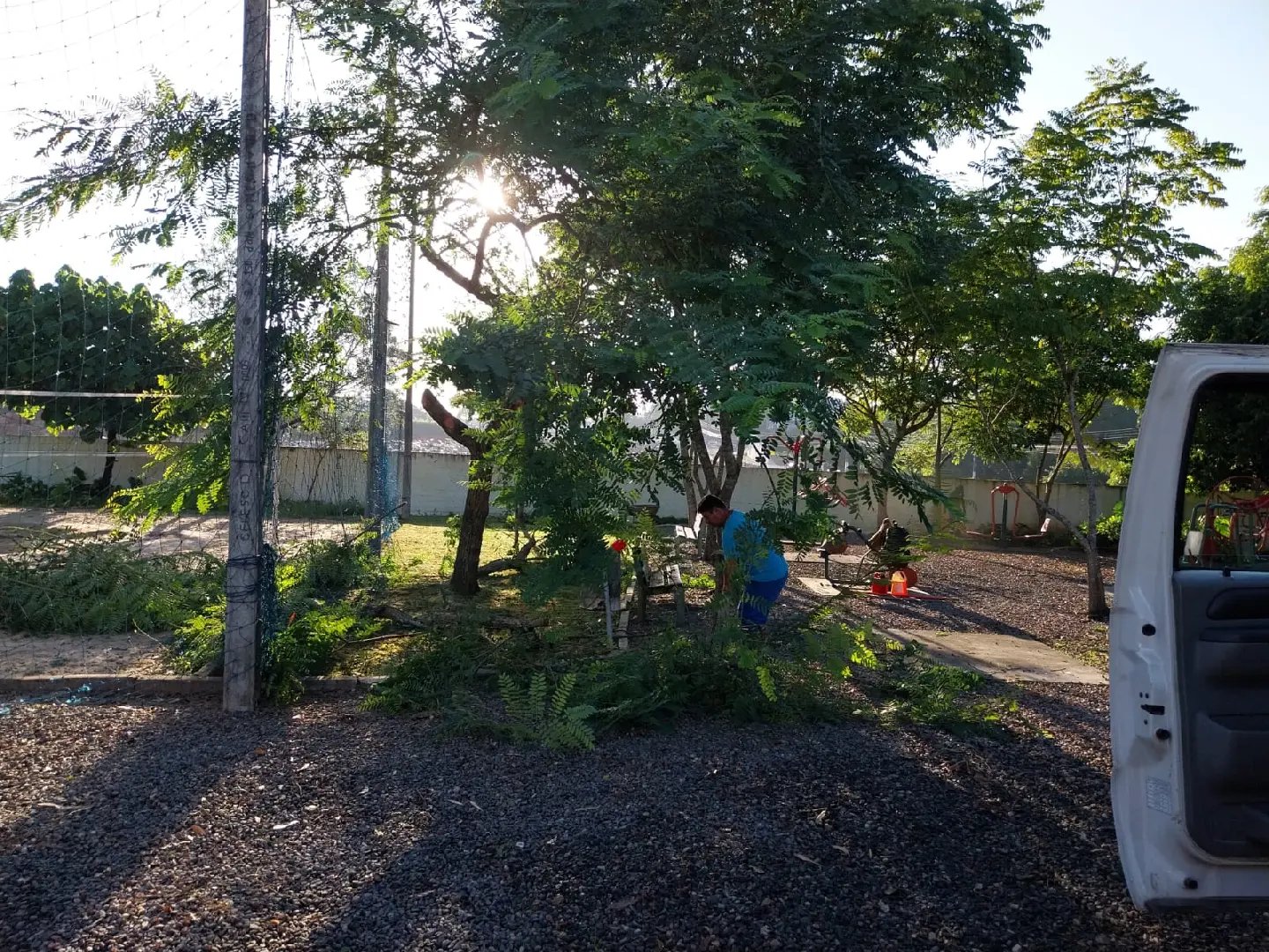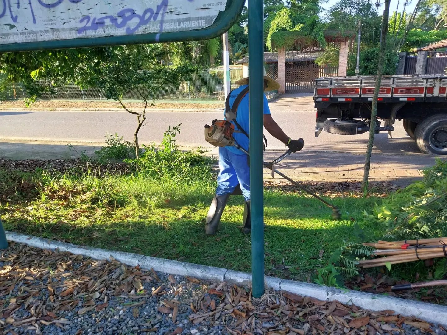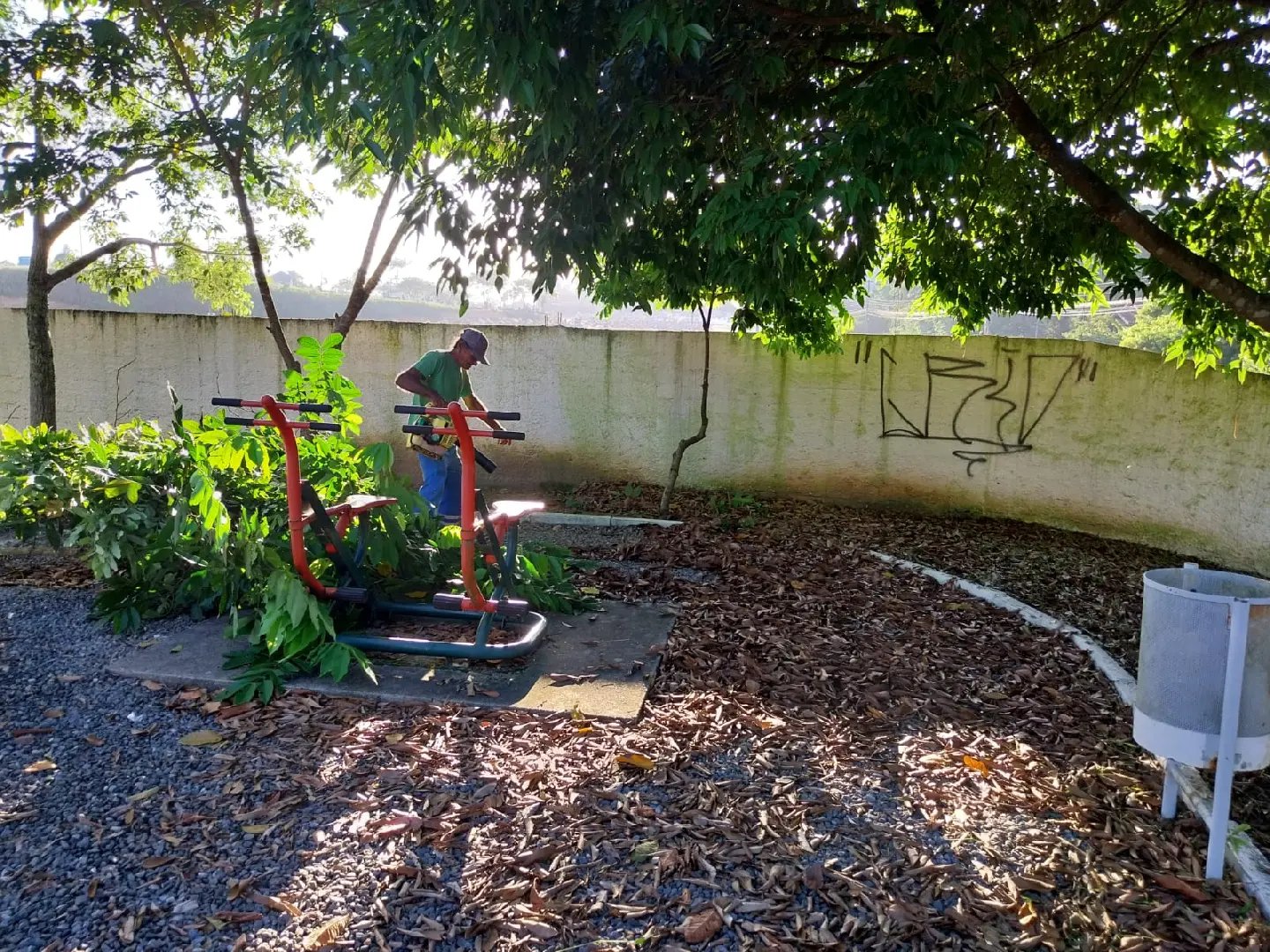 Nas imagens desta quarta-feira enviadas pela própria Prefeitura, mostra que as equipes da Secretaria de Obras estavam fazendo a limpeza do mato que estava alto, com roçadores cortando. Além disso, foi feito a limpeza das folhas pelo local e os galhos grandes de árvores que estavam invadindo a calçada já foram podados.