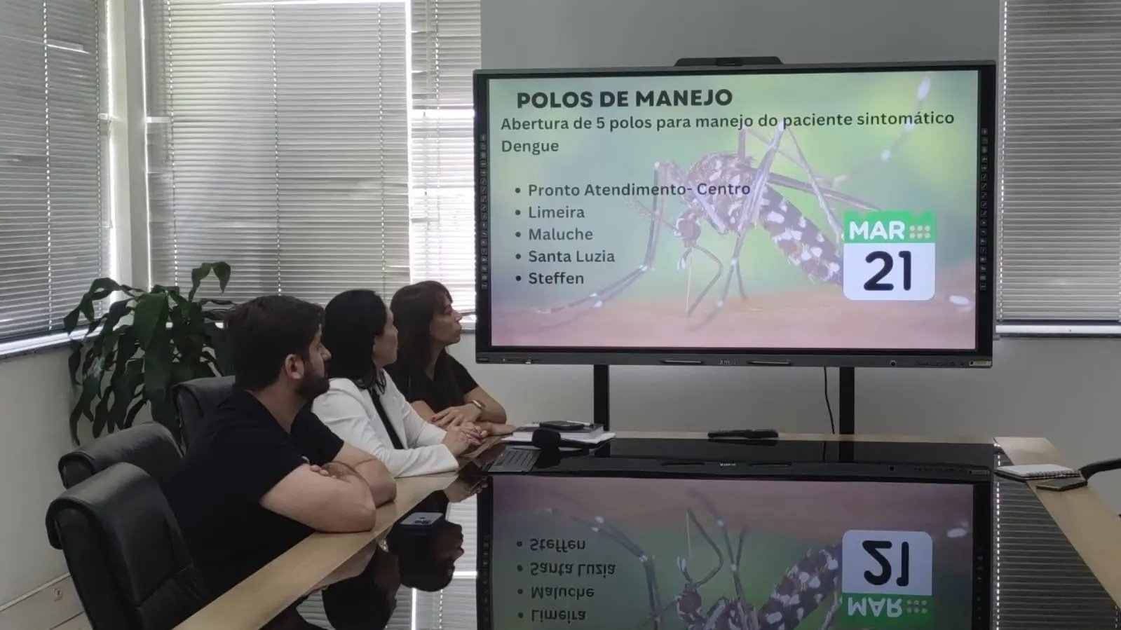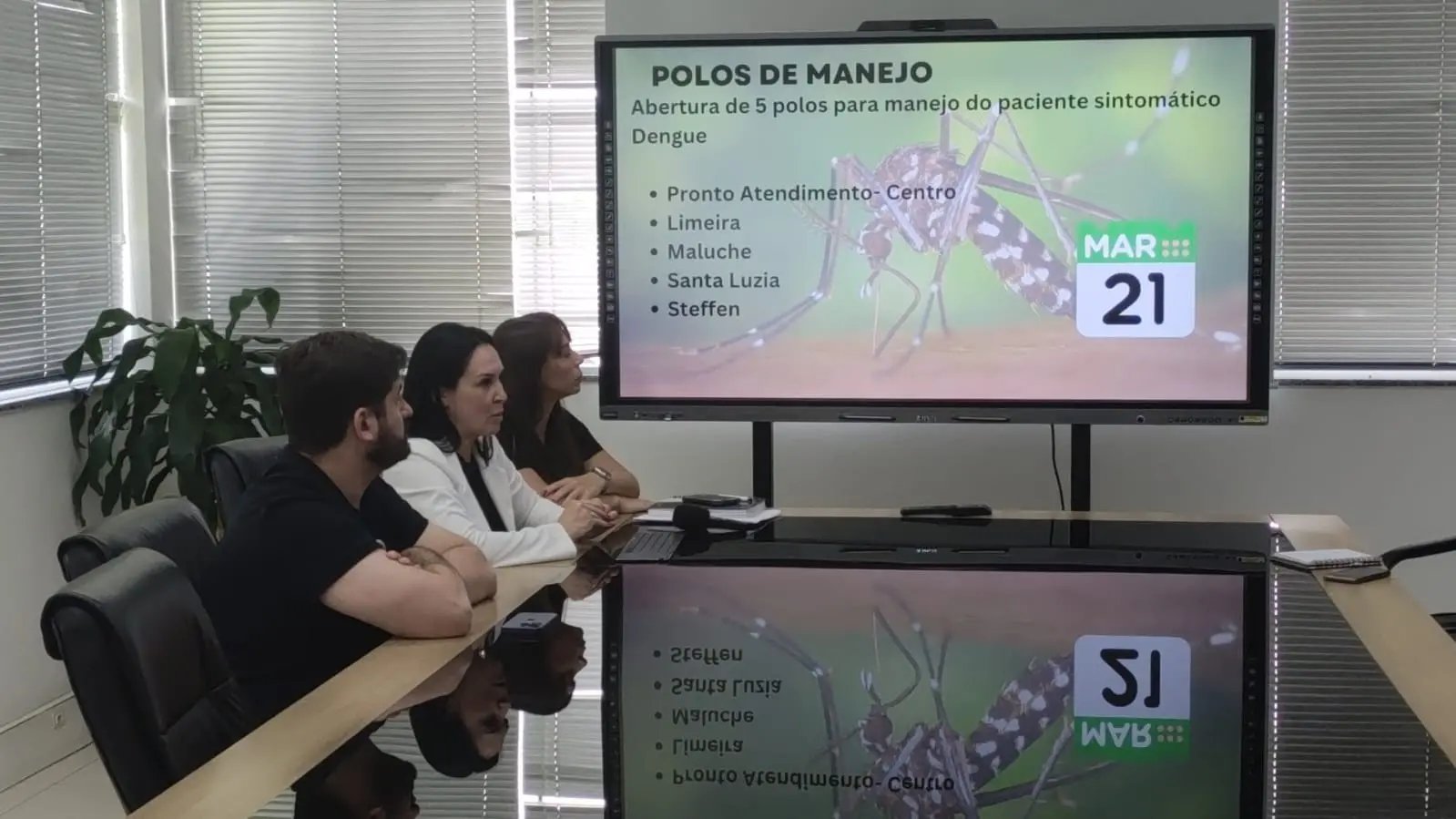 No início da tarde desta segunda-feira (18), a Prefeitura de Brusque, por meio das Secretarias de Comunicação Social e da Saúde, convocou uma coletiva de imprensa para explicar a situação da dengue na cidade. Durante a coletiva, também foi abordada a instalação de quatro polos de hidratação em Unidades Básicas de Saúde espalhadas pela cidade, além de novas medidas que serão implementadas pela prefeitura para combater o mosquito.
