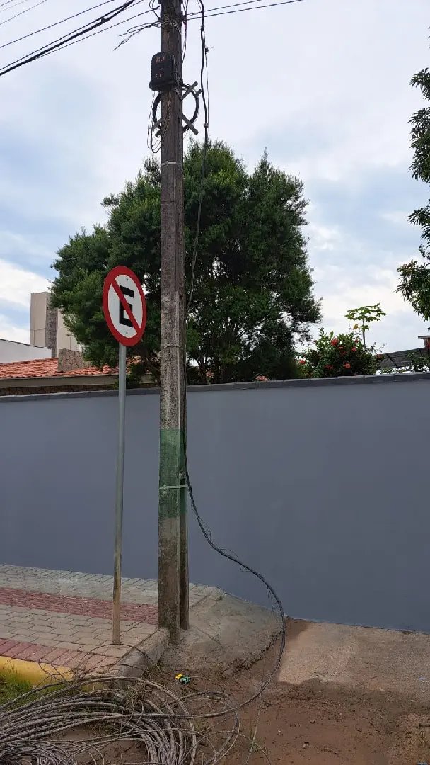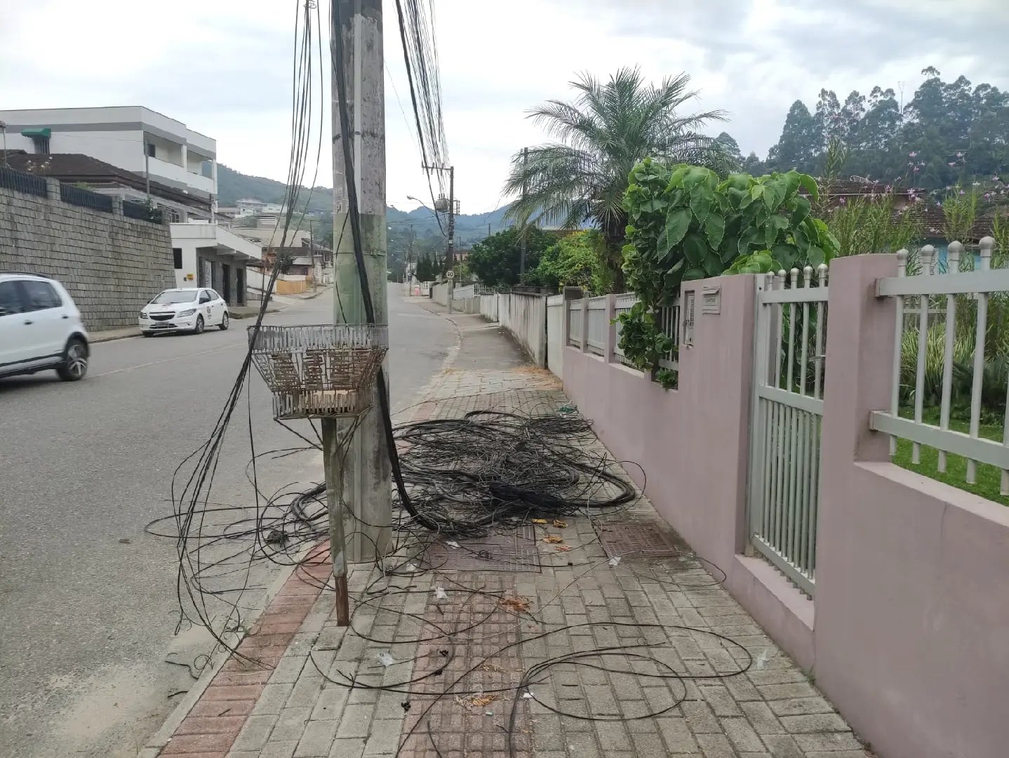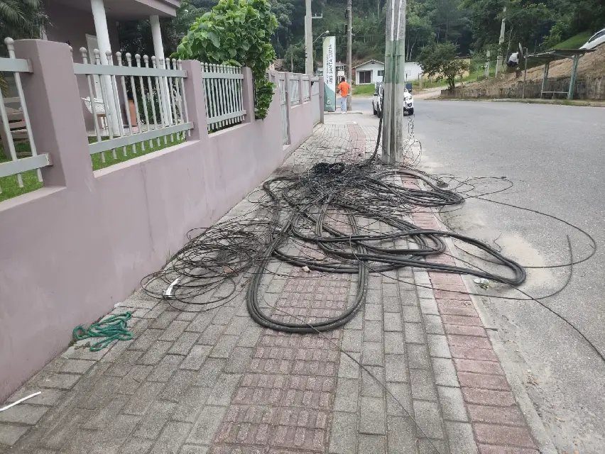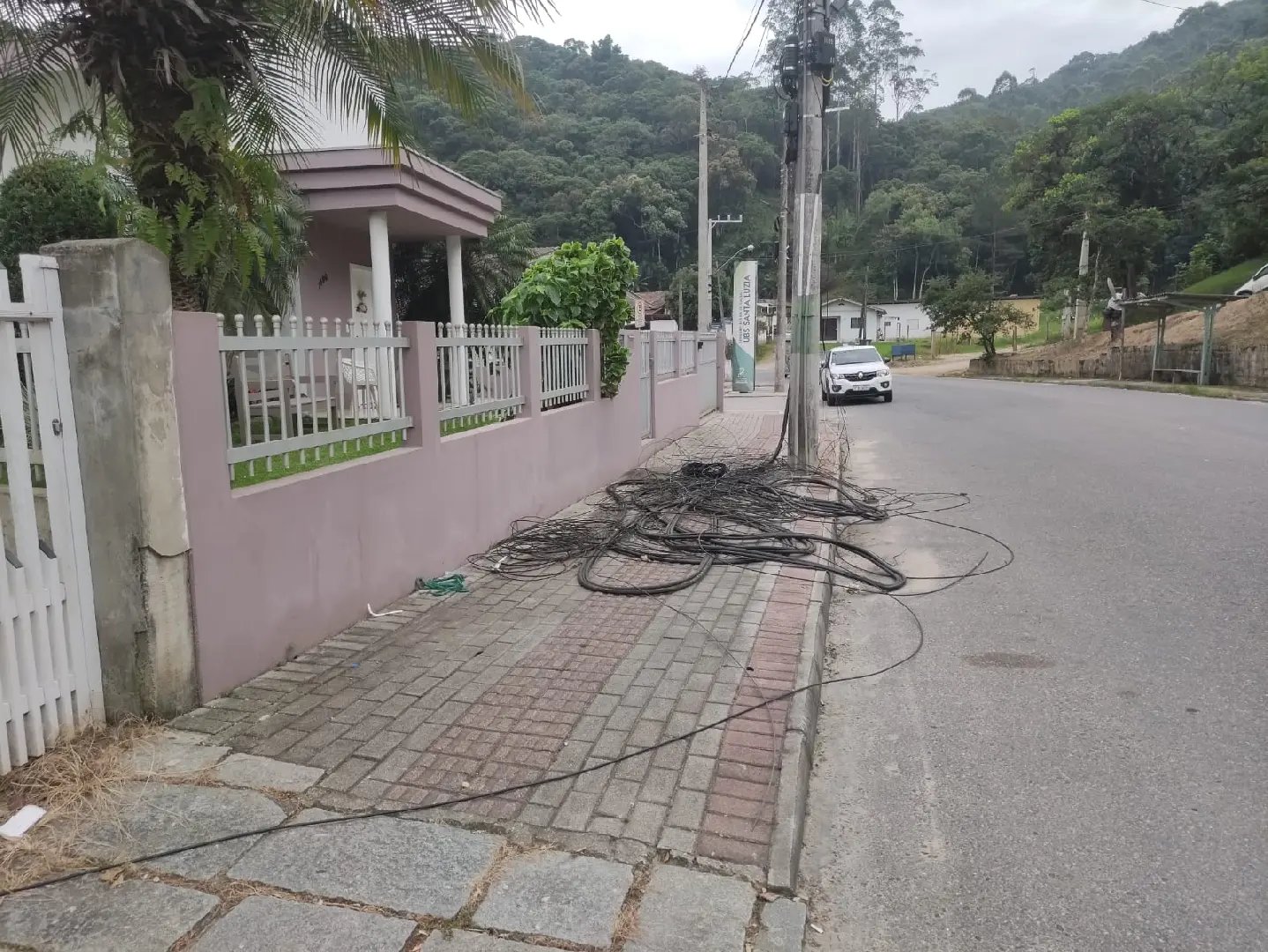 Um amontoado de fios elétricos está jogado em um ponto da calçada da rua Augusto Klapoth, próximo à Unidade Básica de Saúde, do bairro Santa Luzia, em Brusque. Eles estão conectados aos postes, mas não se sabe se estão energizados.