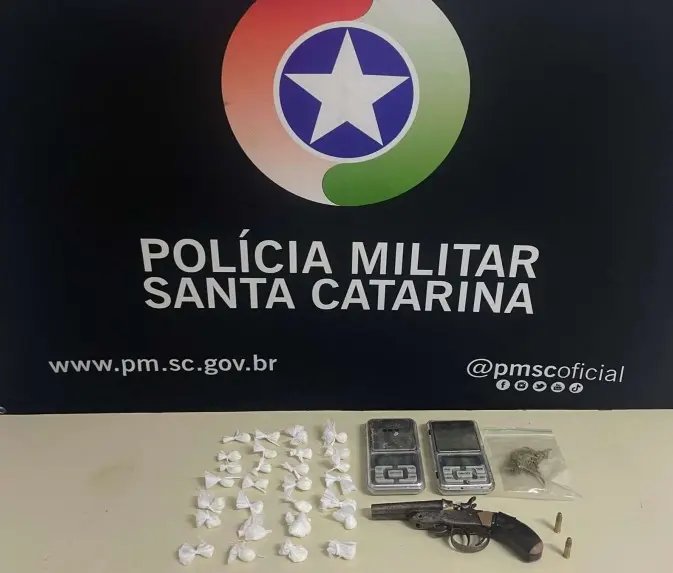 A PM identificou um homem de 25 anos conduzindo um veículo em atitude suspeita, e quando decididos a agir, encontraram com ele 24 gramas de substância análoga à cocaína, cinco gramas de substância análoga à Skank, duas balanças de precisão e um revólver calibre 22, com duas munições dentro.