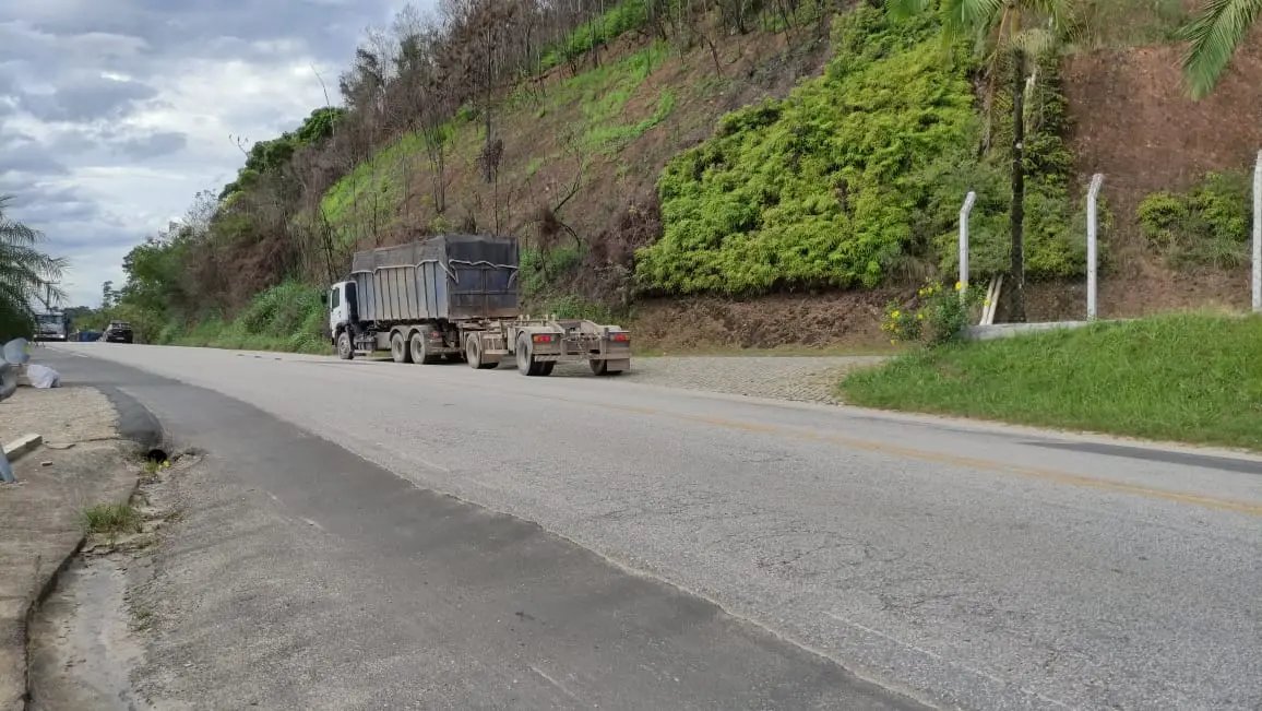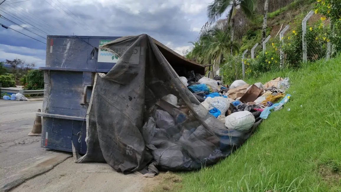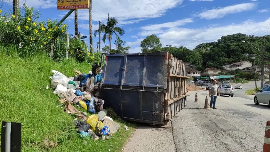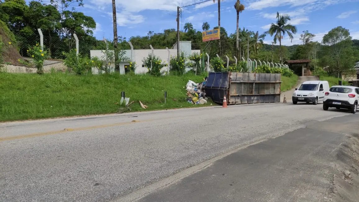 As imagens feitas pela reportagem mostram a caçamba de uma empresa de coleta de entulhos tombada ao lado da via. É possível visualizar que a mesma possuía uma carga de produtos.