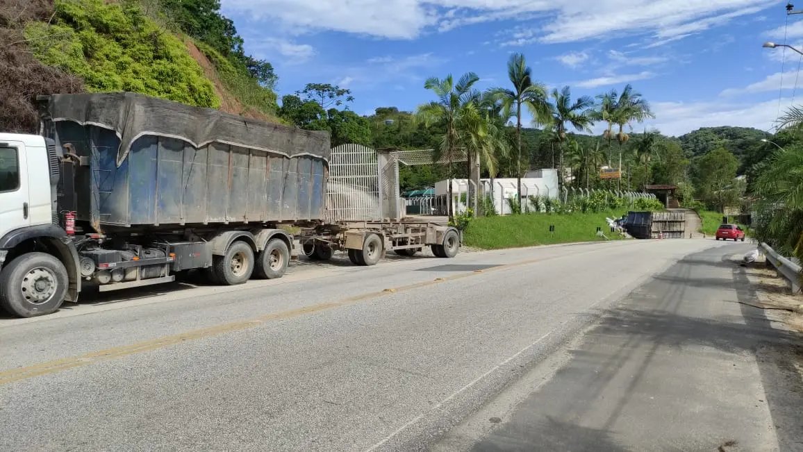 Antes de ocorrer o acidente onde um motociclista foi parar embaixo da roda de um caminhão, a reportagem da Rádio Cidade estava no local para registrar outro acidente. Neste, uma caçamba de um caminhão bitrem havia tombado ao lado da via.