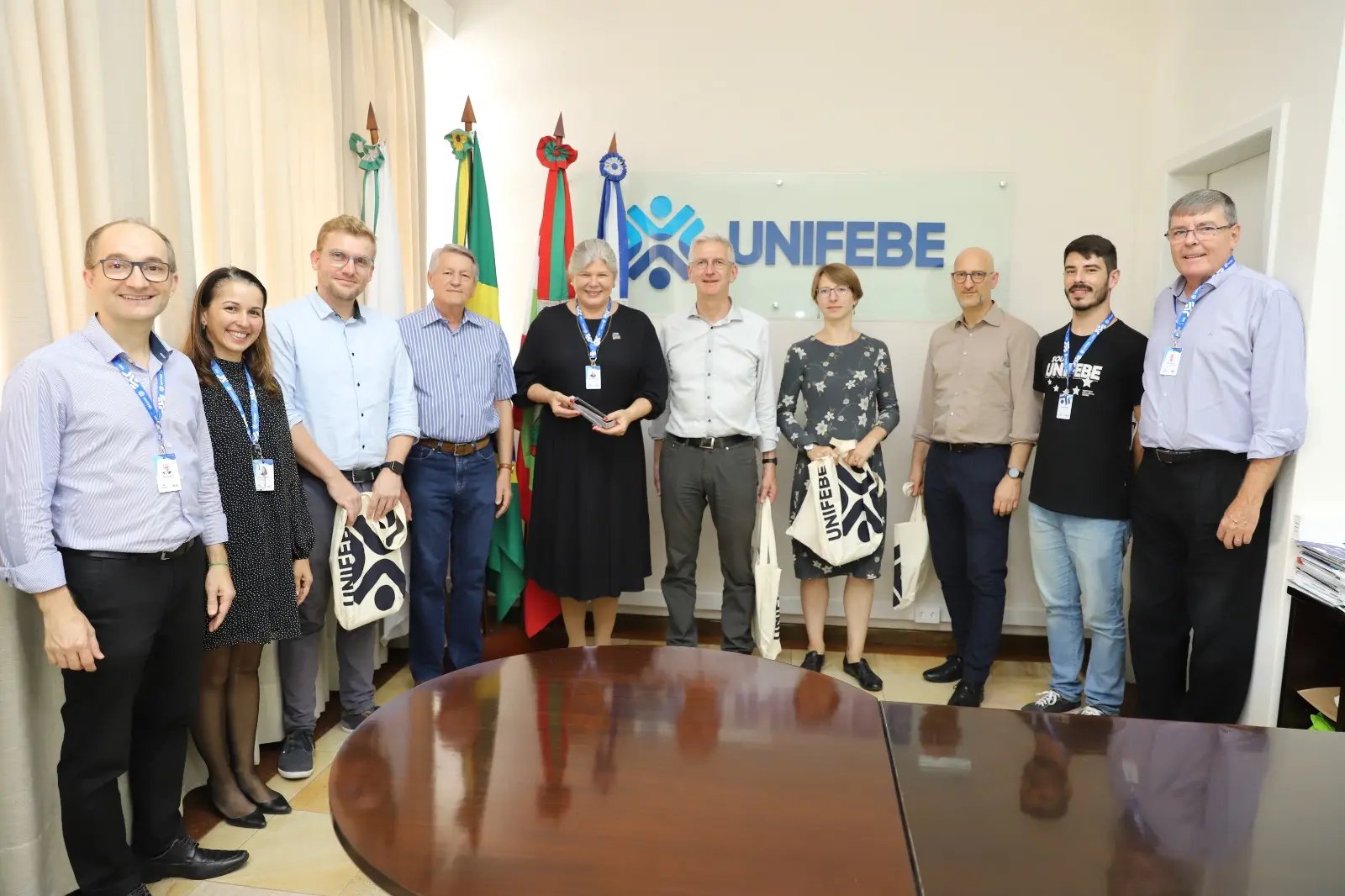 O Centro Universitário de Brusque (UNIFEBE) recebeu nesta quarta-feira (20), uma comitiva da Universidade de Ciências Aplicadas de Karlsruhe (HKA), instituição alemã parceira da UNIFEBE. A reitora da UNIFEBE, professora Rosemari Glatz, o vice-reitor, professor Sergio Rubens Fantini, o pró-reitor de Graduação, professor Sidnei Gripa e a pró-reitora de Pós-Graduação, Pesquisa, Extensão e Cultura, professora Edinéia Pereira da Silva e o relações internacionais da UNIFEBE, Leonardo Rigon Kasmarek, receberam o chefe do International Office, Joachim Lembach, o professor titular da faculdade de Gerenciamento de Informações e Mídia, Wolfgang Ziegler, do coordenador de cursos COIL, Moritz Brüstle, e a coordenadora do Projeto Bachelor International, Nora Gröninger.