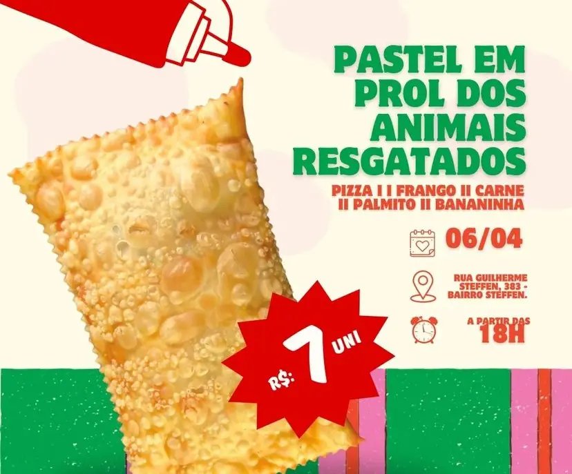 Uma iniciativa inspiradora está mobilizando Brusque em prol dos animais resgatados. No dia 06 de abril, a partir das 18h, na Rua Guilherme Steffen, n°383, você é convidado(a) a participar do evento "Pastel em Prol dos Animais Resgatados", promovido pela protetora animal independente Maria Eduarda Martins.