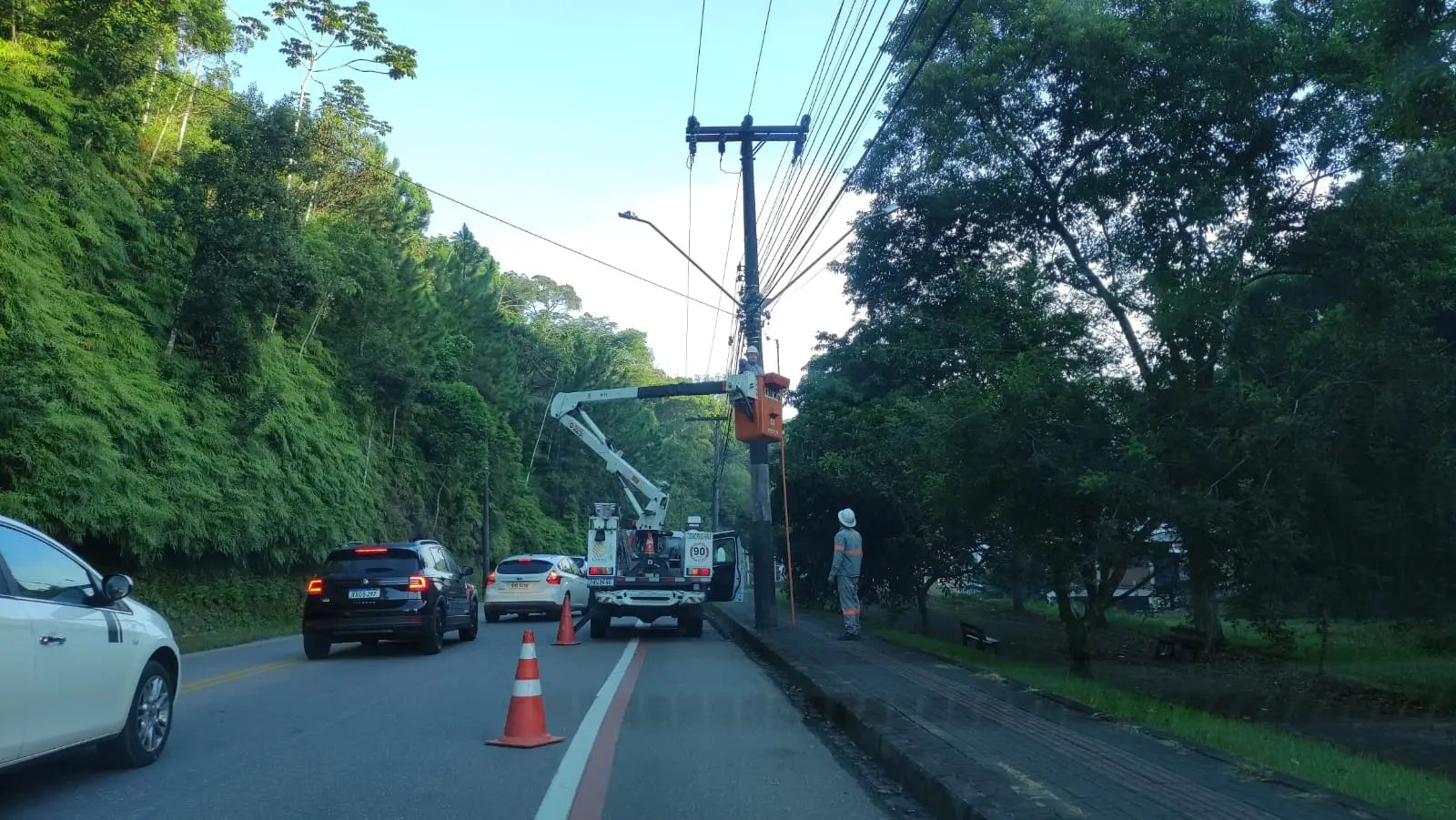A foto anexada a esta matéria é de um flagra da equipe de reportagem da Rádio Cidade, onde é possível ver um serviço da Celesc tentando achar e reparar o problema em um poste, localizado na Rua Florianópolis, próximo à antiga Renaux.