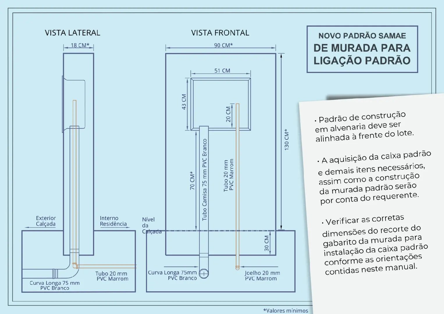 O setor de atendimento do Samae disponibilizará um material explicativo com todas as informações necessárias, como a construção de murada, dimensões e altura para instalação da caixa padrão atualizada. Além disso, a Instrução Normativa atualizada pode ser encontrada no site do Samae.