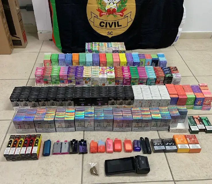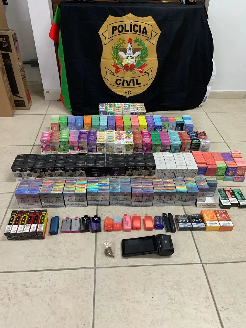 No imóvel do investigado foram apreendidos mais de 400 "vaps", carregadores para o dispositivo, máquina de cartão de crédito e até adesivos da marca utilizada pelo investigado para comercialização do produto, além de uma porção de maconha.