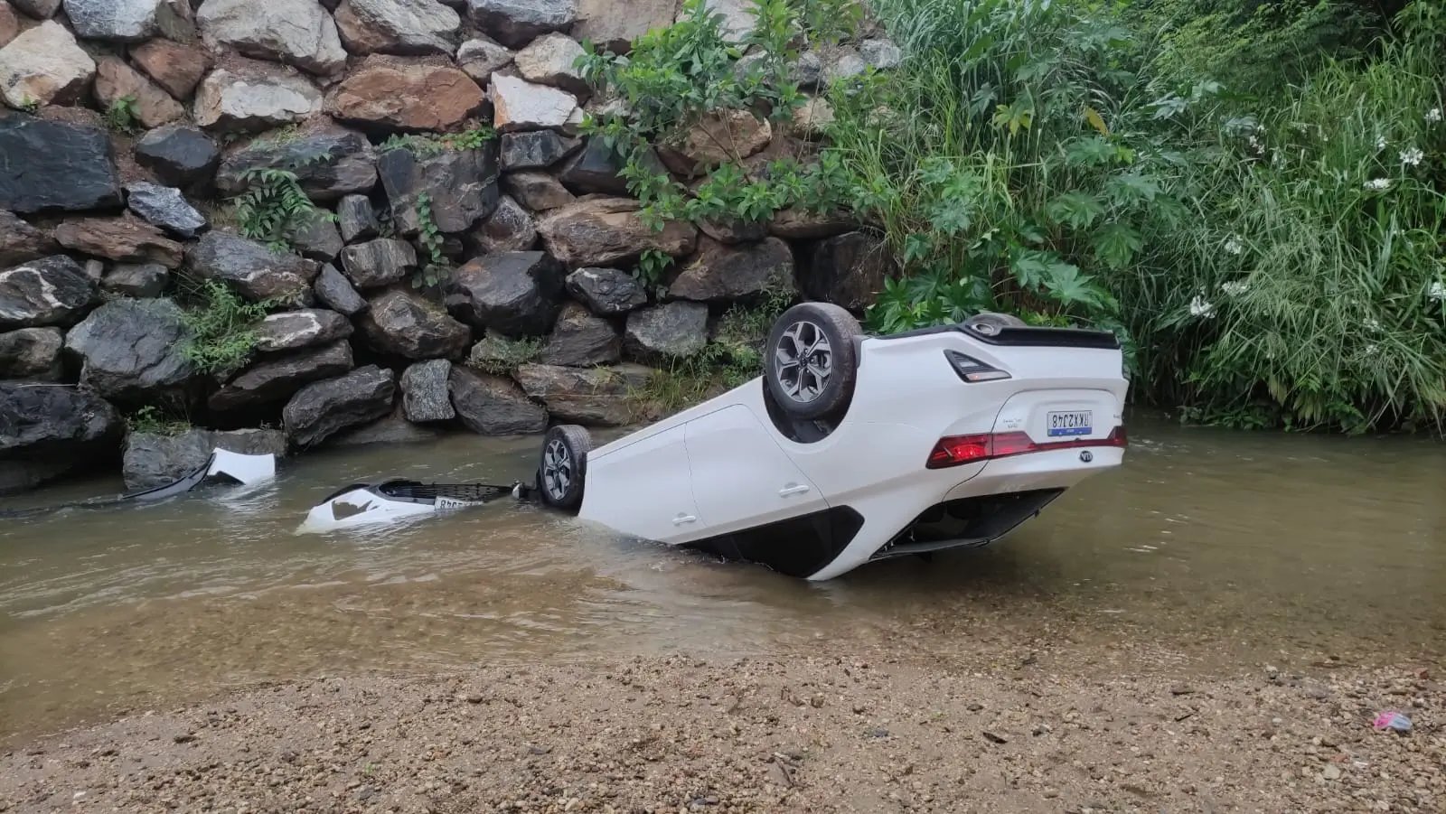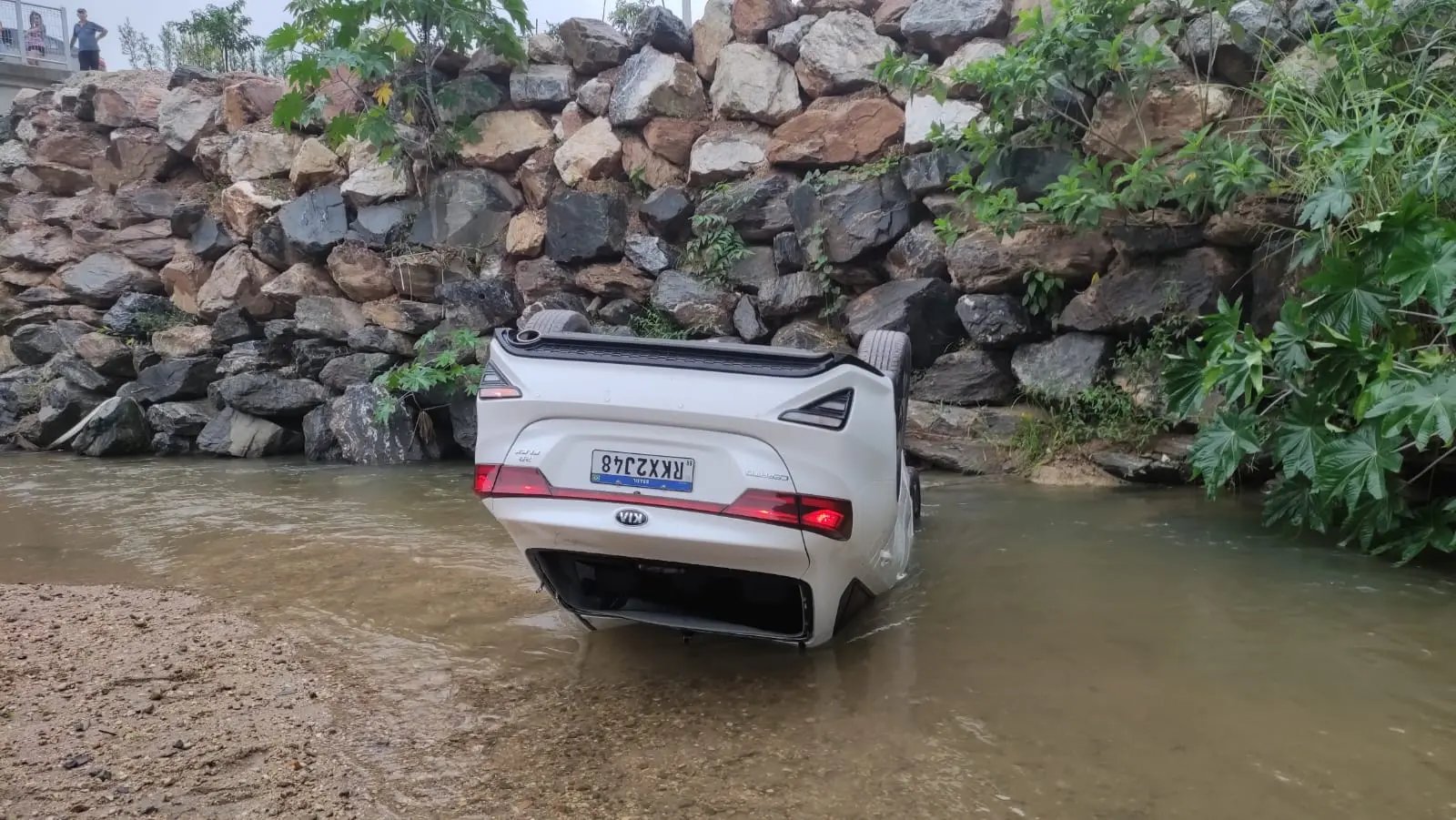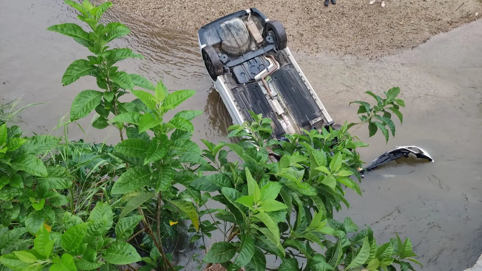 O veículo despencou e ficou com as rodas para cima, além de parte da frente submersa. A mulher também relatou que acredita ter esquecido de puxar o freio de mão.