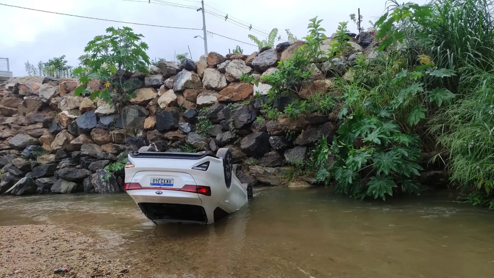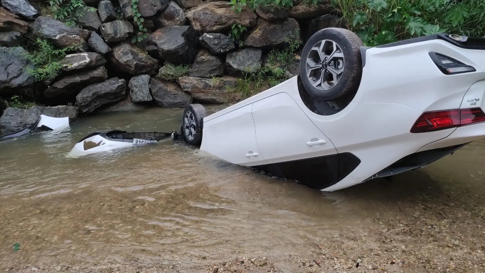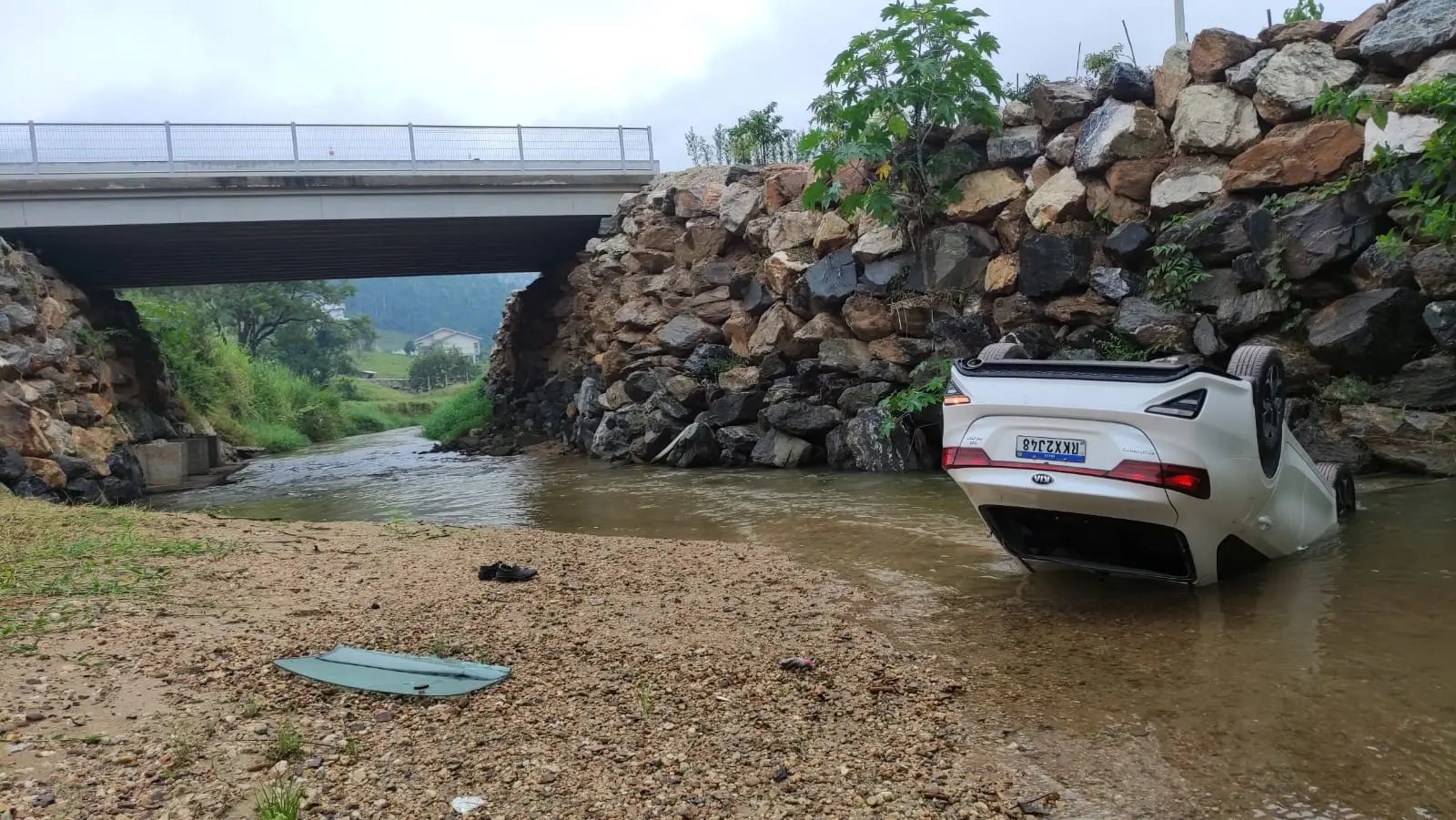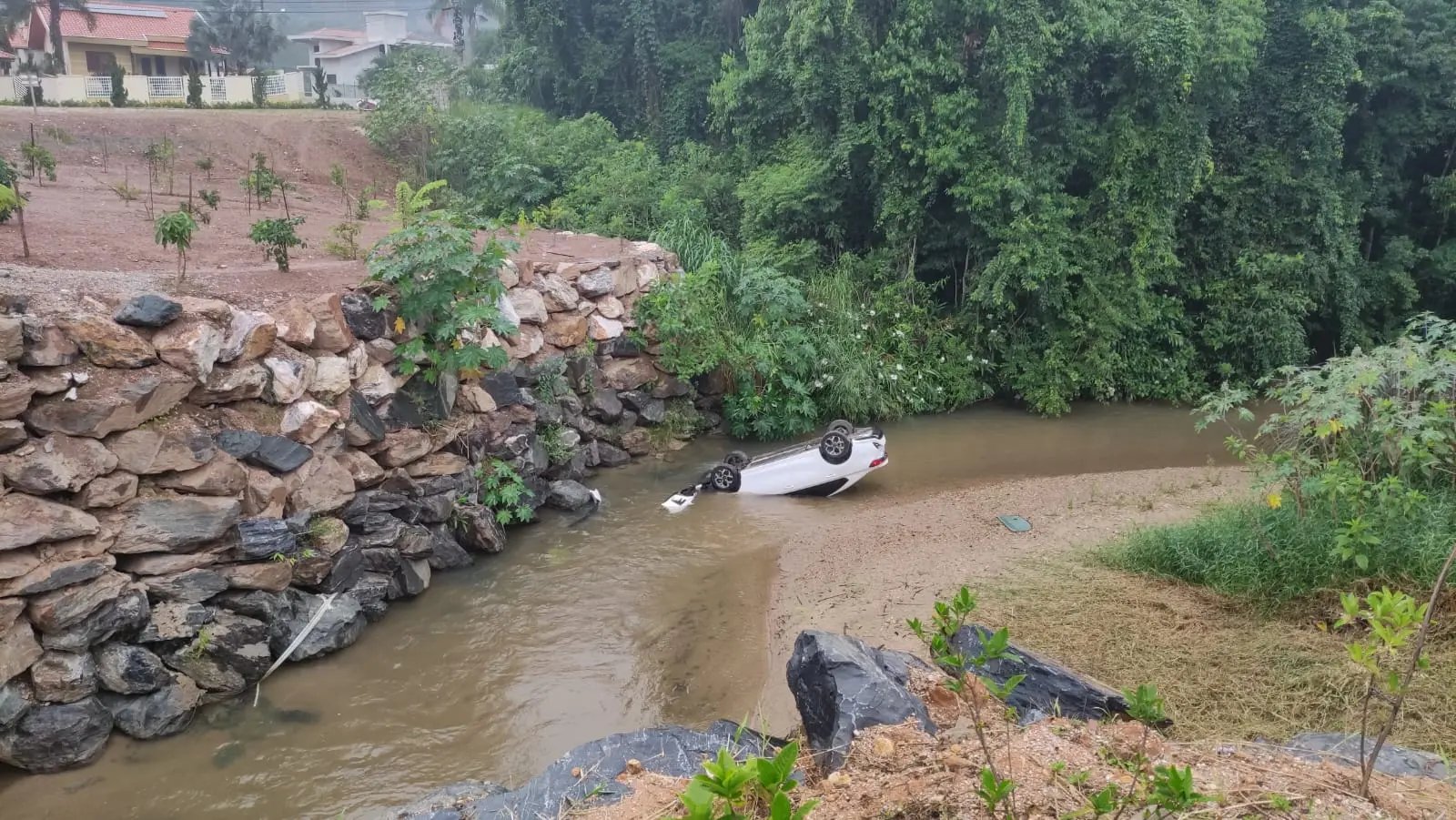 O veículo despencou e ficou com as rodas para cima, além de parte da frente submersa. A mulher também relatou que acredita ter esquecido de puxar o freio de mão.