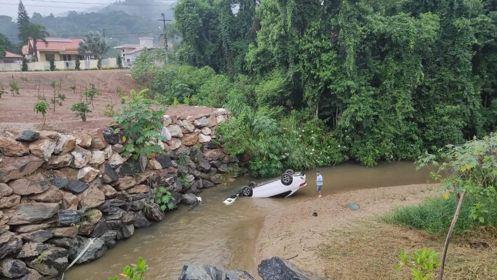 Um veículo acabou caindo no rio na manhã desta segunda-feira (8), em Brusque. O fato foi registrado na Rua David Hort, no bairro Cedro Alto.