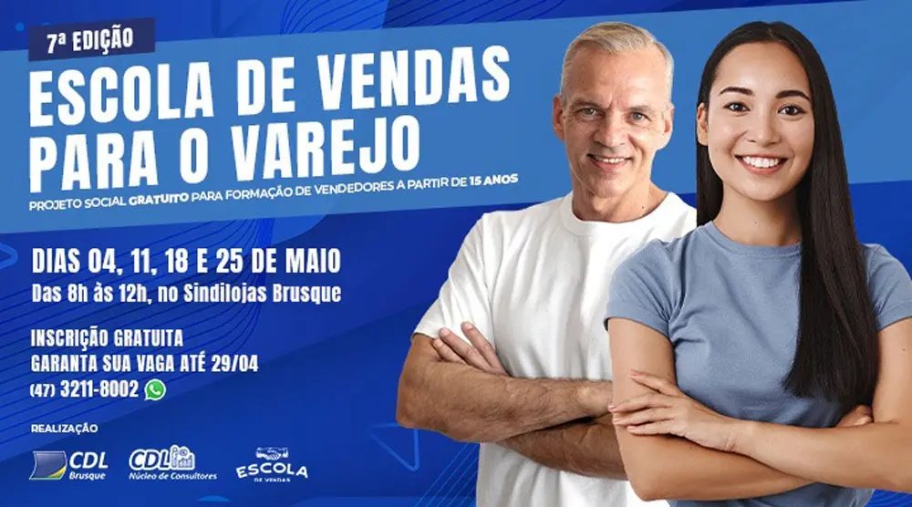 Estão abertas as inscrições para a 7ª edição da Escola de Vendas para o Varejo, realizada pela Câmara de Dirigentes Lojistas de Brusque (CDL Brusque). O curso tem o objetivo de capacitar profissionais na área de vendas para trabalharem no comércio local. A formação gratuita será nos dias 4, 11, 18 e 25 de maio, na sede do Sindilojas.