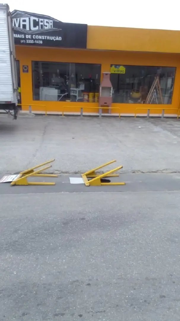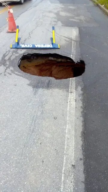Nas imagens, é visto que um cavalete da Defesa Civil foi colocado em volta do buraco. Dentro do buraco há pedaços de asfalto e, ao lado do cavalete há três cones de trânsito para reforçar a sinalização.