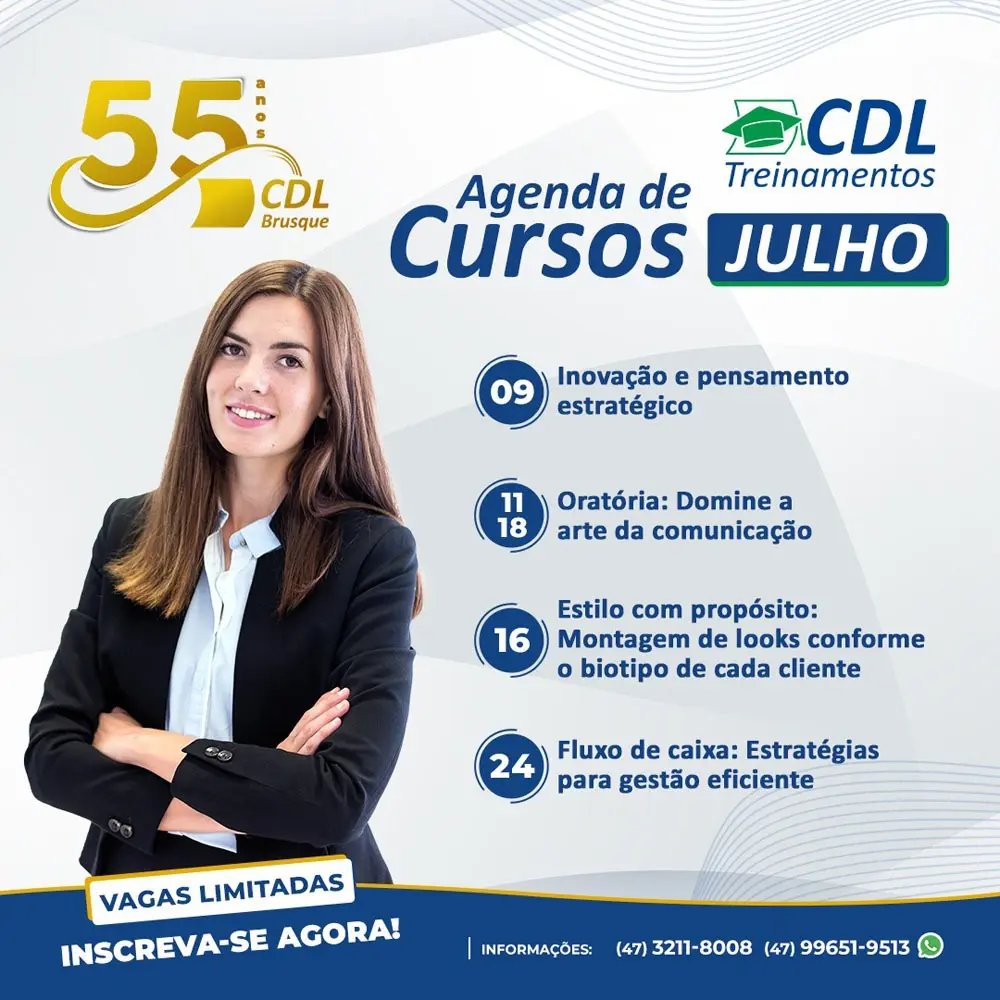A Câmara de Dirigentes Lojistas de Brusque (CDL Brusque) está com inscrições abertas para os cursos de julho da CDL Treinamentos. Neste mês, serão oferecidas quatro capacitações nas áreas de inovação, oratória, estilo e fluxo de caixa.