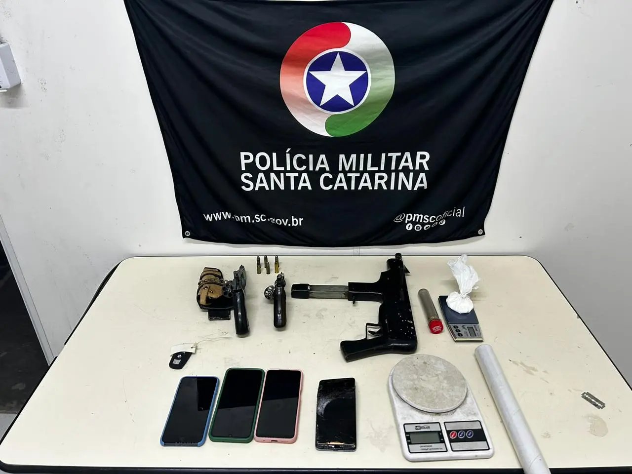 O último suspeito, de 19 anos, foi localizado no bairro Itoupavazinha. No fundo de sua residência, em um depósito, foi encontrada uma arma de fabricação caseira, estilo metralhadora, bem como aproximadamente 25 gramas de cocaína, 50 gramas de crack, duas balanças de precisão e material para embalar drogas.