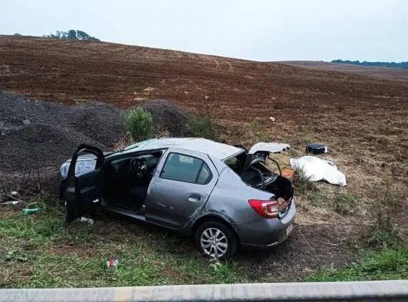 Segundo a Polícia Rodoviária Federal (PRF), o carro saiu de pista e capotou na via. O automóvel em questão é um Renault Logan com placas de Brusque.