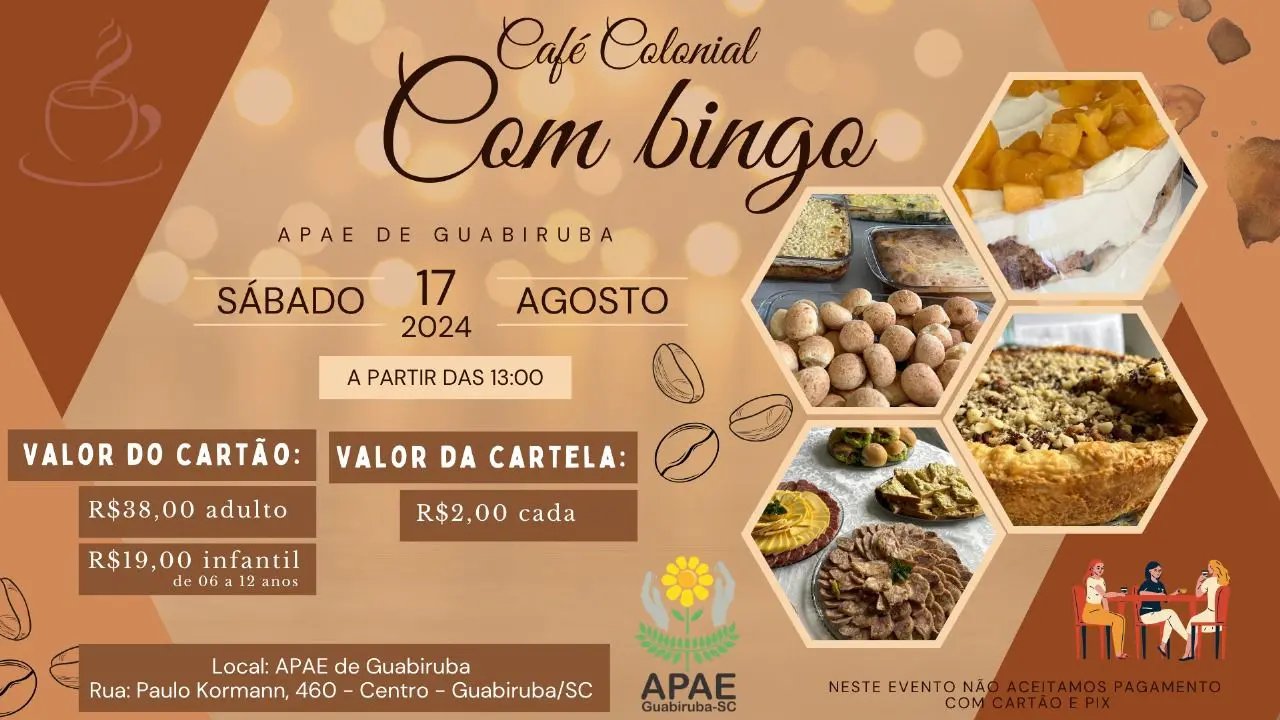 Na tarde do próximo sábado (17), a APAE de Guabiruba estará realizando mais uma edição do seu tradicional café colonial com bingo. O evento ocorre a partir das 13h, na sede da entidade localizada na rua Paulo Kormann, no bairro Centro.