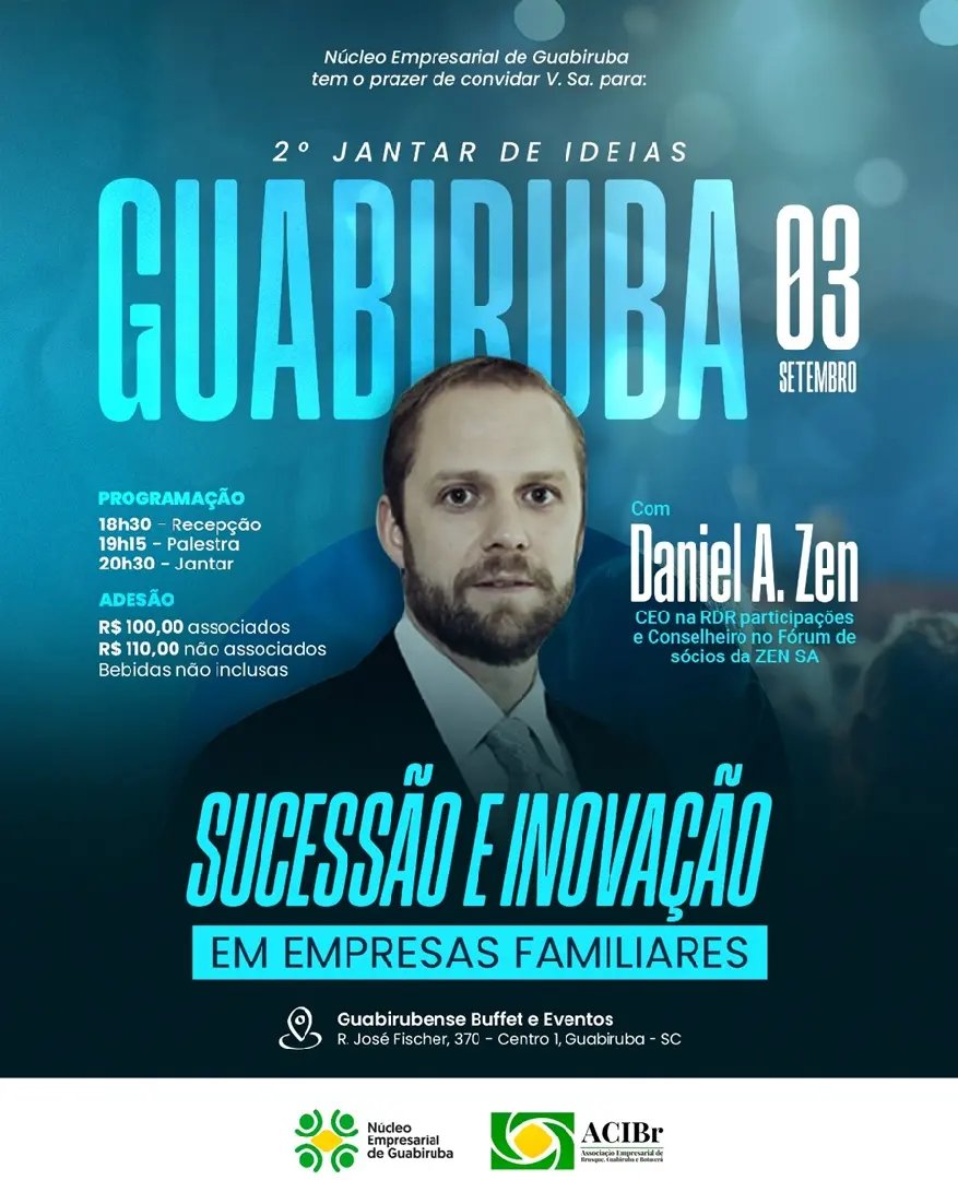O Núcleo Empresarial de Guabiruba, da Associação Empresarial de Brusque, Guabiruba e Botuverá (ACIBr), realiza o 2º Jantar de Ideias. O evento será no dia 3 de setembro, no Guabirubense Buffet e Eventos.