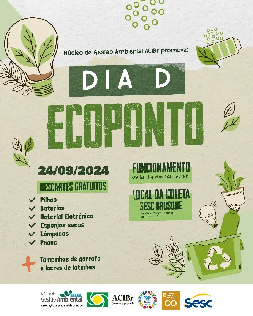Na próxima terça-feira (24), a Fundação Municipal do Meio Ambiente (Fundema) e o Núcleo de Gestão Ambiental da Associação Empresarial de Brusque (Acibr) realizam o Dia D Ecoponto. A ação será no Sesc Brusque, das 9h às 11h e das 14h às 16h. Na oportunidade, poderão ser descartados gratuitamente pilhas, baterias, material eletrônico, esponjas secas, lâmpadas, pneus, tampinhas de garrafa e lacres de latinha.