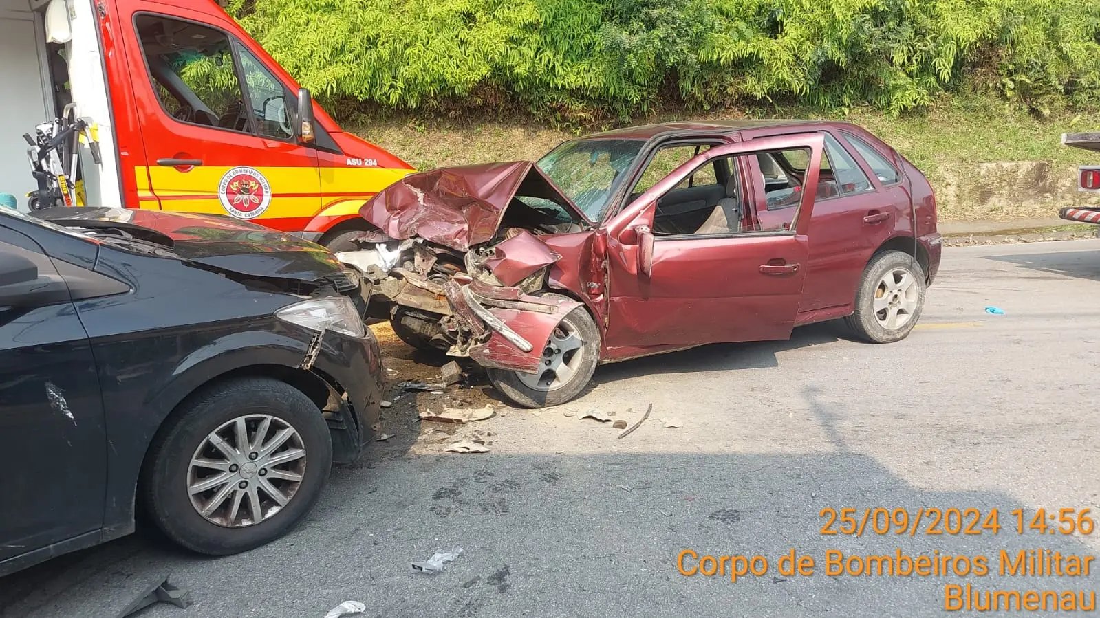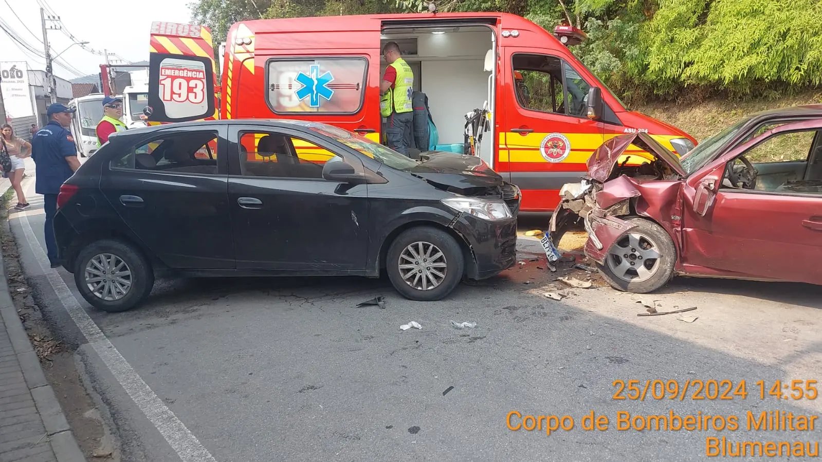 Quatro pessoas ficaram feridas na tarde desta quarta-feira (25) após uma colisão frontal entre dois carros. O acidente aconteceu por volta das 14h15, no bairro Progresso, em Blumenau.