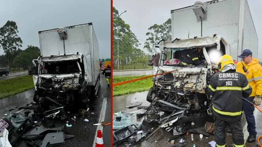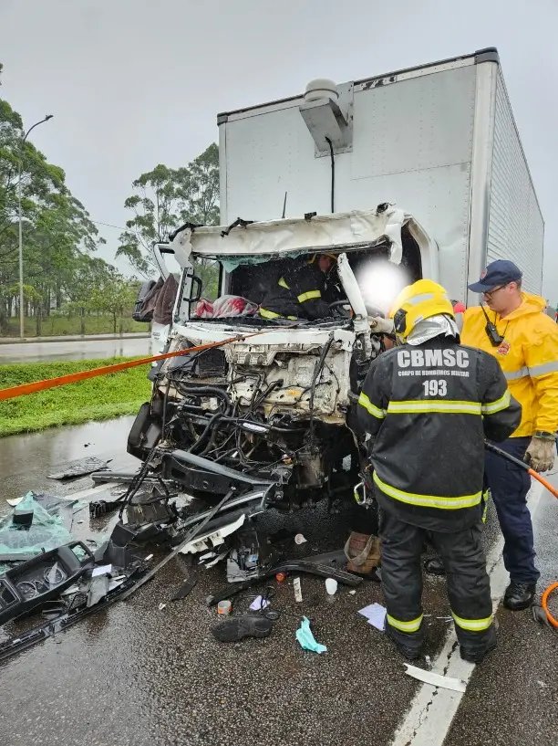 Um homem ficou preso nas ferragens após uma colisão traseira entre dois caminhões na BR-101. Foi na tarde desta quinta-feira (10), por volta das 13h26, em Itapema.