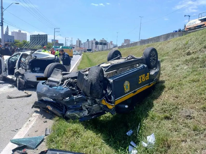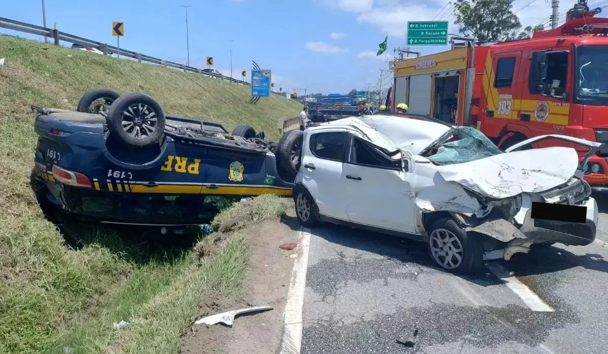 Segundo a PRF, o acidente aconteceu no sentido Sul da rodovia. O carro conduzido pela mulher foi atingido pela viatura, que capotou e parou na calha lateral de drenagem da via. Em seguida, o caminhão foi atingido na lateral pelo veículo de passeio, conforme o relatório dos bombeiros.