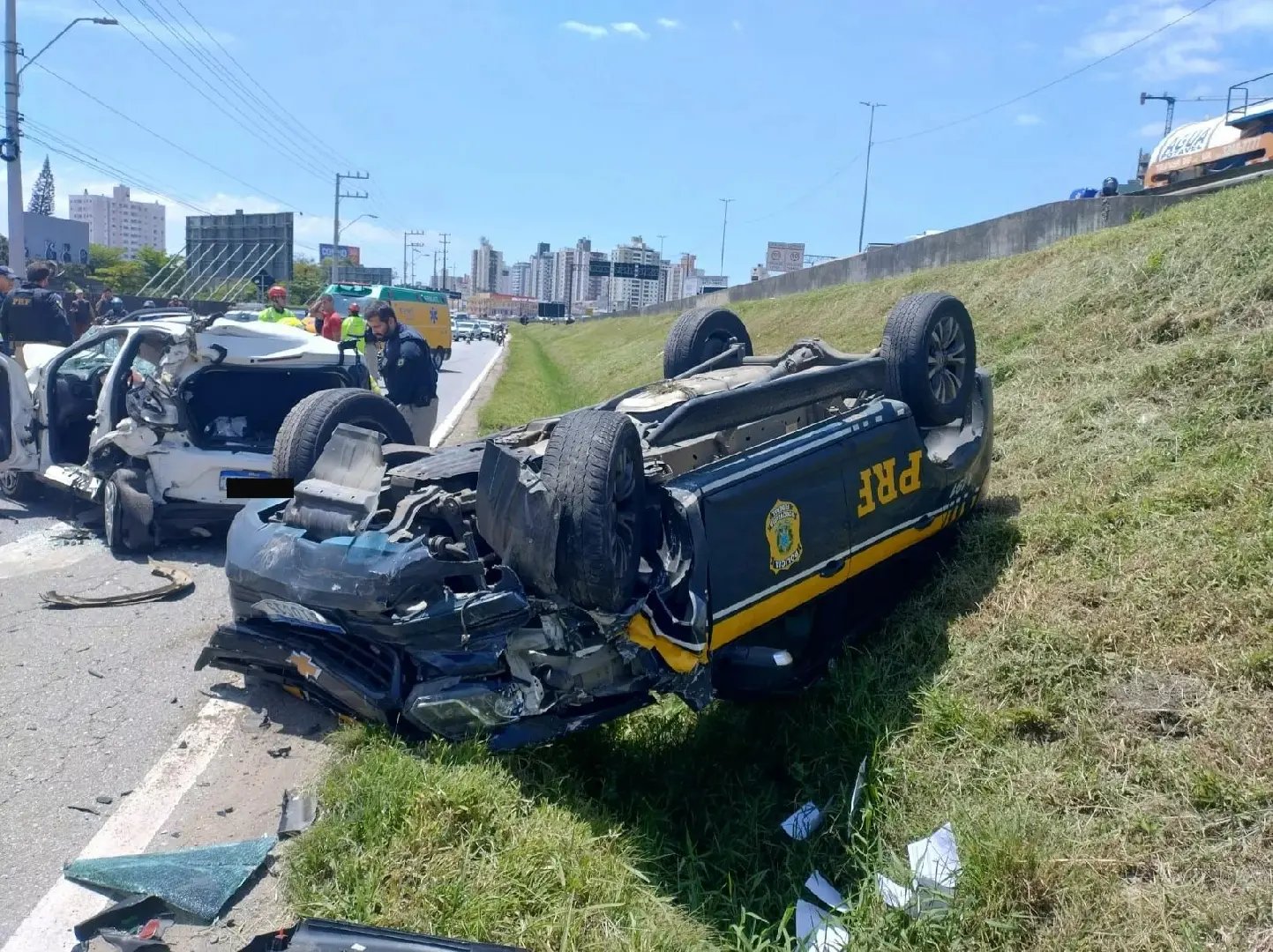 Viatura da PRF capota em acidente que deixou vítima presa às ferragens