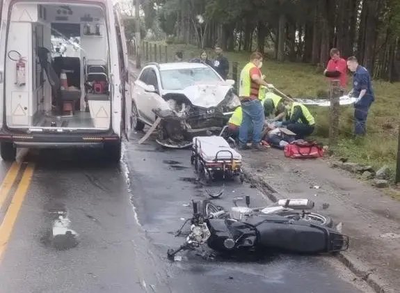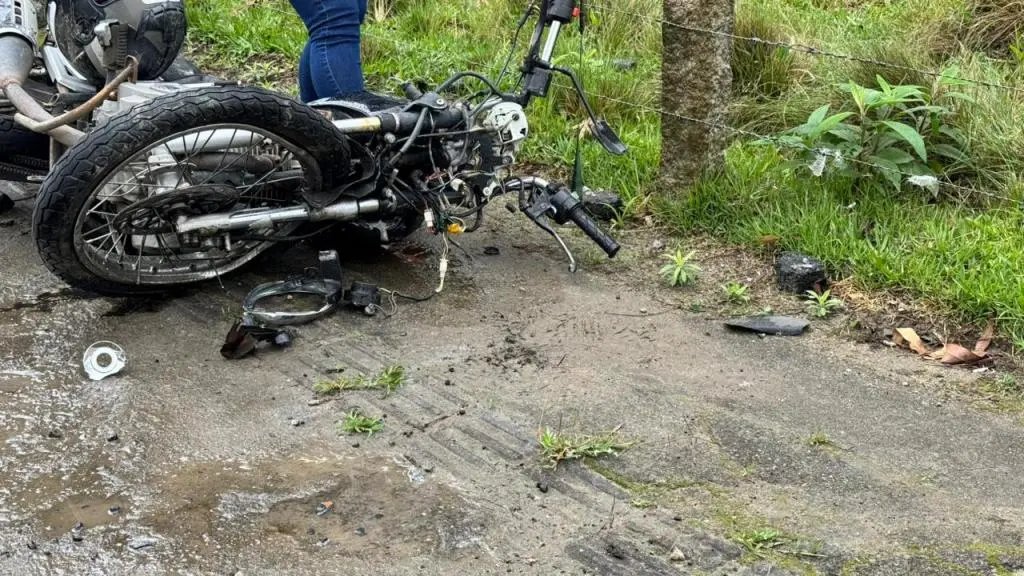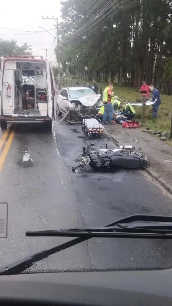 Um motociclista foi parar em uma cerca de arame farpado após uma colisão frontal entre um carro e uma moto na manhã desta segunda-feira (21), em Porto Belo. O acidente ocorreu por volta das 07h15, na estrada geral do bairro Santa Luzia, entre Tijucas e Porto Belo.