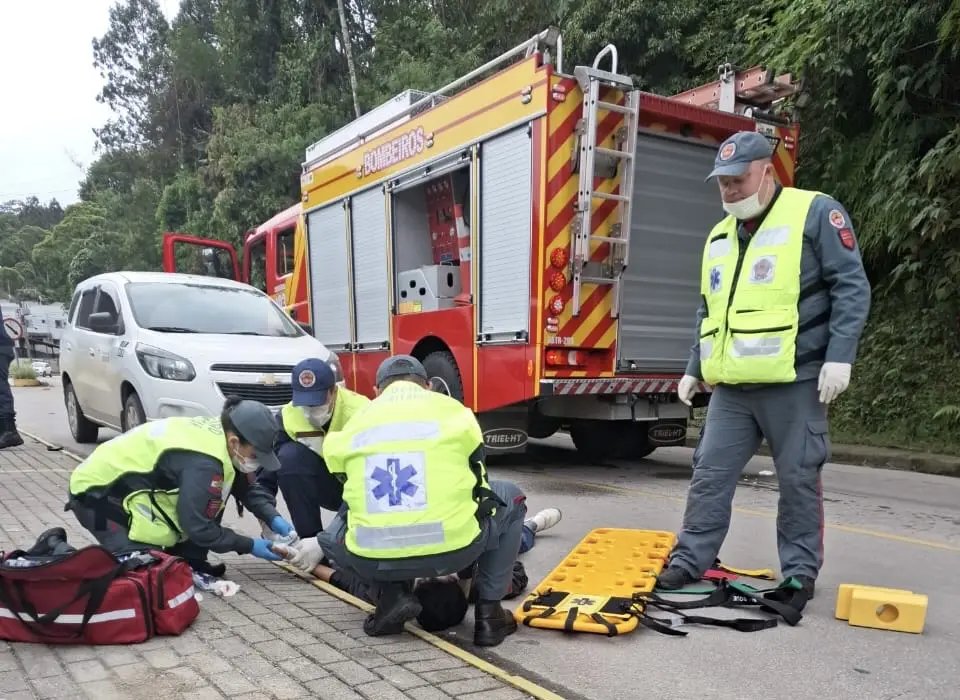 Segundo os bombeiros, no local foi encontrado o motociclista, um homem de 21 anos, consciente e orientado, apresentando ferimentos no antebraço direito, mão esquerda, joelho esquerdo e região posterior da coxa.