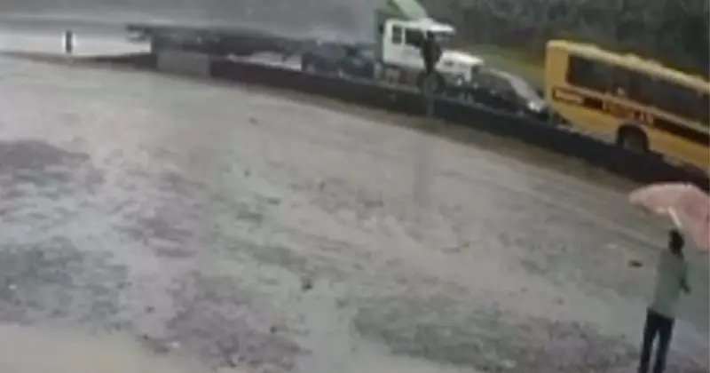 Nas imagens, é possível ver o momento em que o caminhão atinge um carro preto, que fica prensado atrás de um ônibus escolar. No momento da colisão chovia na região.