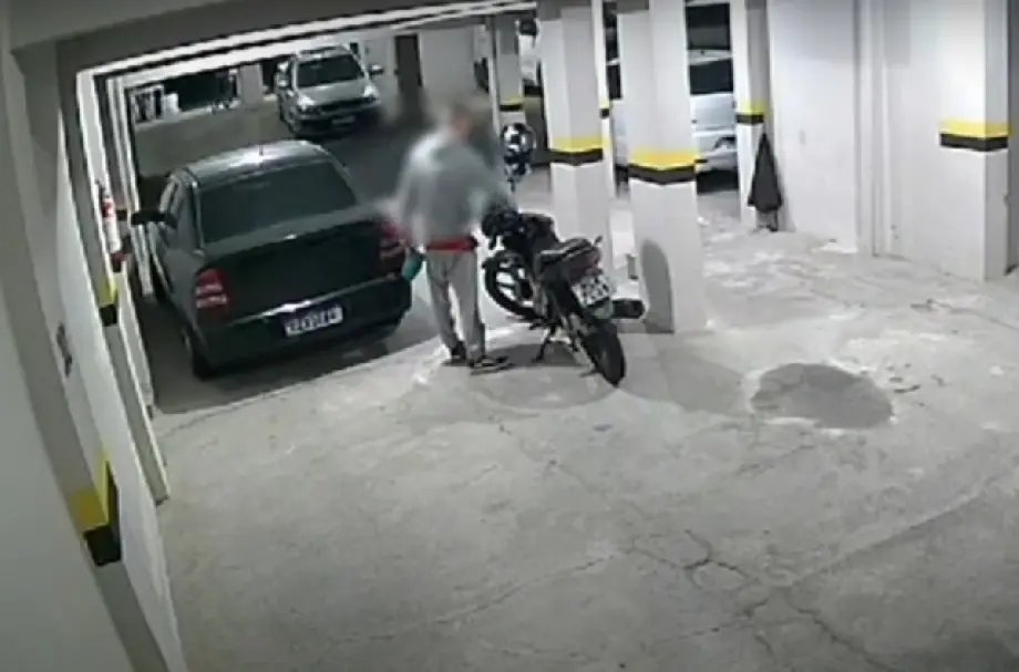 O suspeito de pele clara e cabelo escuro e curto vestia um tênis preto, além da calça e moletom cinza. Através do vídeo é possível ver ele dentro da garagem do condomínio, se aproximando do veículo e o ligando, colocando o capacete, subindo na moto e tomando rumo desconhecido.