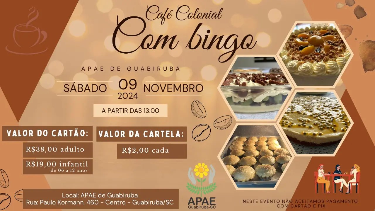 Na tarde do próximo sábado (9), a APAE de Guabiruba estará realizando mais uma edição do seu tradicional café colonial com bingo. O evento ocorre a partir das 13h, na sede da entidade localizada na rua Paulo Kormann, no bairro Centro.