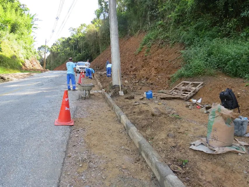 Entre o barranco e a pista de rolamento, existia uma calha para direcionamento das águas pluviais que já estava muito danificada, com buracos e rasgos causados pelo fluxo da água, o que estreitava a pista e aumentava os riscos. Para resolver esse problema, foi necessário instalar tubulações adicionais e confeccionar novas bocas de lobo, garantindo um melhor direcionamento e captação das águas pluviais. Com isso, foi possível corrigir a situação existente e ampliar o espaço disponível para a construção da calçada.
