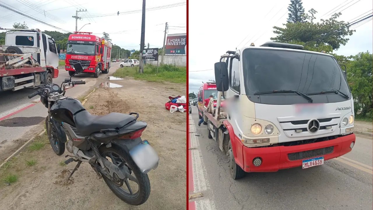 Uma colisão traseira entre uma moto e um caminhão deixou um adolescente de 16 anos gravemente ferido na manhã desta terça-feira (12), em Porto Belo. O acidente ocorreu por volta das 10h38, na avenida José Neoli Cruz.