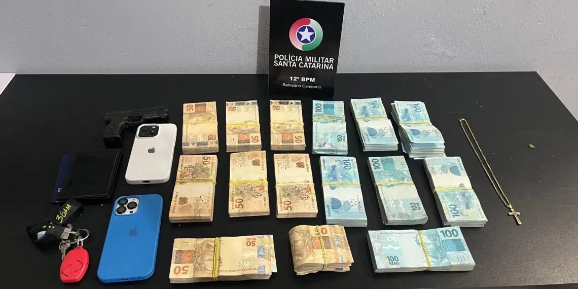 Conforme a PM, o automóvel foi localizado na Avenida das Flores, com dois homens em seu interior. Durante a revista no veículo, os policiais encontraram no porta-malas uma caixa contendo um simulacro de arma de fogo e R$ 109.900 em espécie.