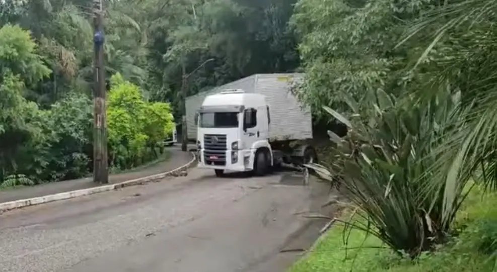 O caminhão - que seria de uma transportadora - ao tentar subir o morro, foi realizar a curva e acabou ficando “trancado”, não possibilitando a passagem de outros veículos em ambos os sentidos da rua.