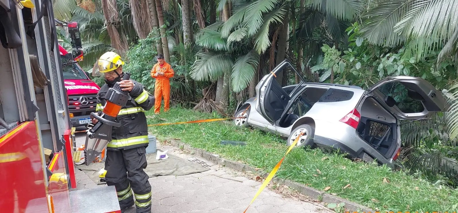Um carro saiu da pista, colidiu contra a vegetação e ficou em posição inclinada em uma ribanceira, no início da tarde desta quarta-feira (18). O Corpo de Bombeiros Militar (CBM) de Blumenau foi acionado para atender o acidente, que aconteceu na rua Max Humpl, no bairro Salto do Norte, em Blumenau.