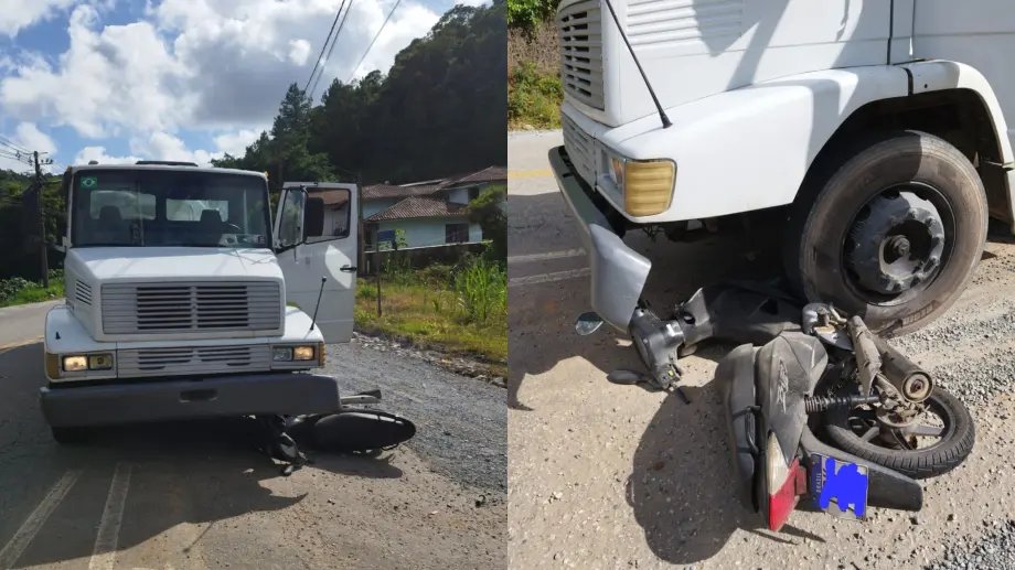 Uma mulher de 24 anos ficou ferida na manhã deste sábado (8) após um acidente entre uma moto Honda Biz e um caminhão Mercedes-Benz na rodovia Pedro Merízio, em Botuverá. O acidente aconteceu por volta das 8h44, e a moto foi parar embaixo da roda do caminhão.