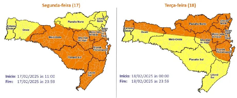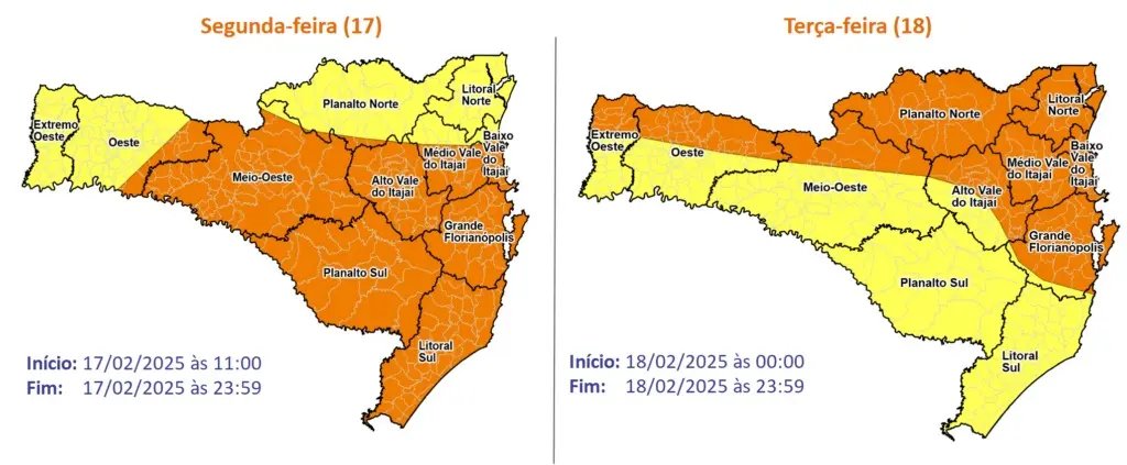 A Defesa Civil de Santa Catarina emitiu, na manhã desta segunda-feira (17), um aviso meteorológico alertando para a alta probabilidade de chuva forte em Brusque e região, que estão em nível laranja no mapa de monitoramento.