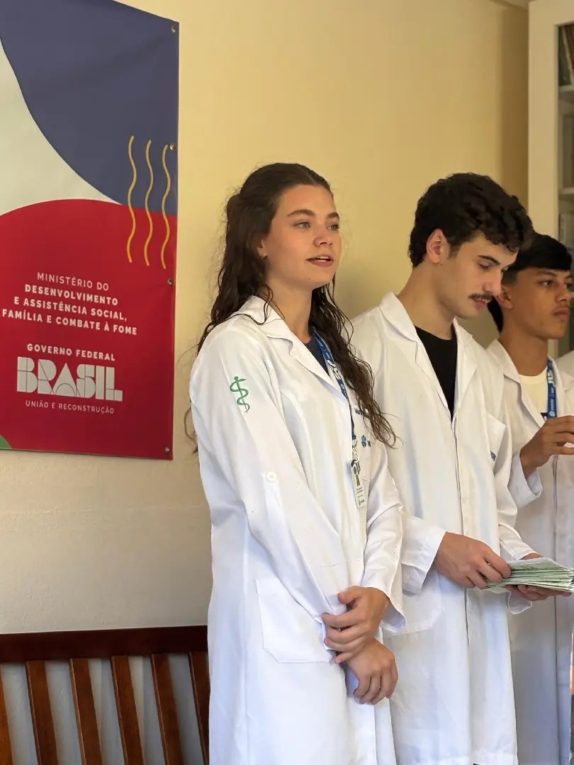 Em visita anterior ao recanto, os estudantes conheceram a rotina dos acolhidos, o trabalho dos consagrados e da equipe técnica. A partir dessa vivência, construíram um cronograma de apresentações voltado à conscientização sobre os impactos da dependência química no organismo humano.