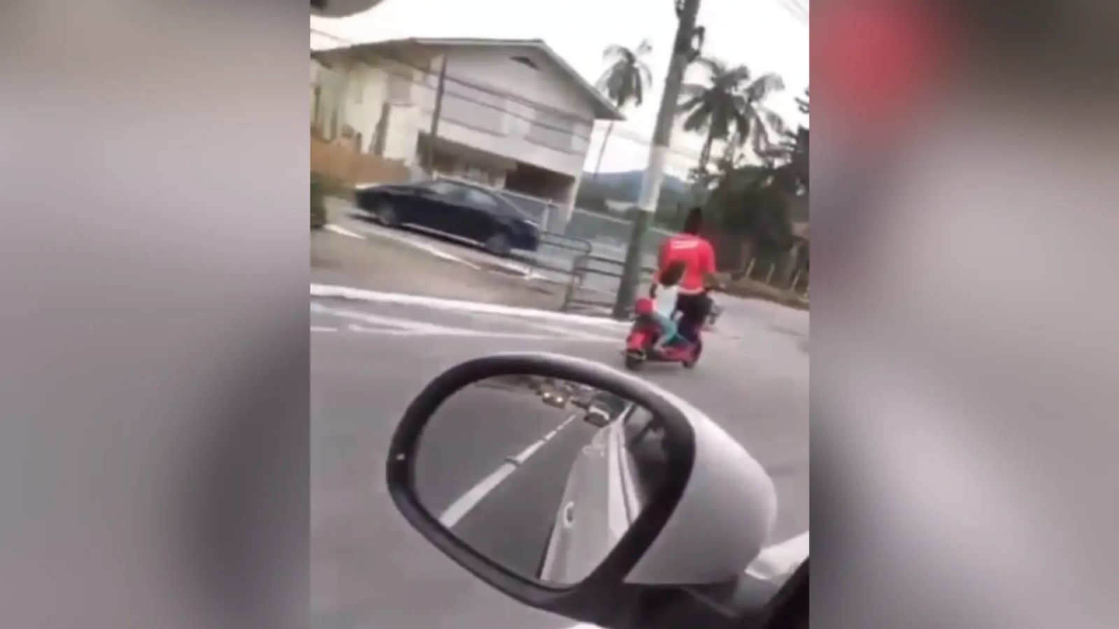 Essa criança aparece sentada no banco enquanto segura na cintura da condutora, que está sentada em um assento um pouco mais elevado. Nem ela nem a mulher aparecem utilizando equipamentos de segurança, como um capacete.