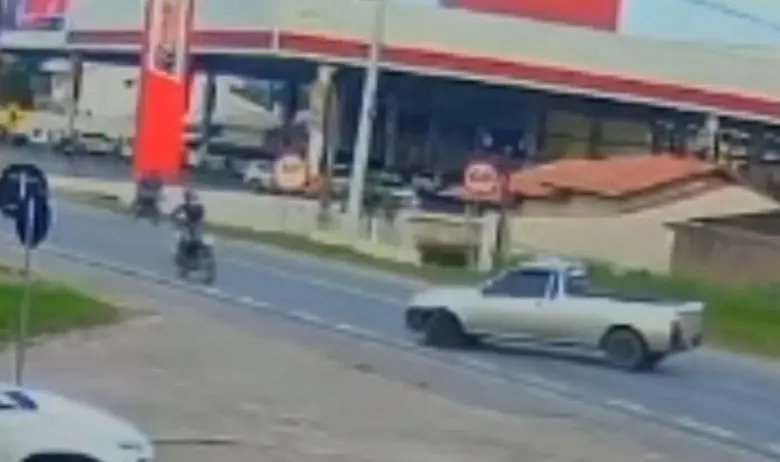 Nas imagens, é possível ver o instante em que ocorre a colisão entre os veículos. Um dos ocupantes da moto é lançado para dentro da parte traseira da caminhonete Ford Courier, enquanto o outro cai no chão.