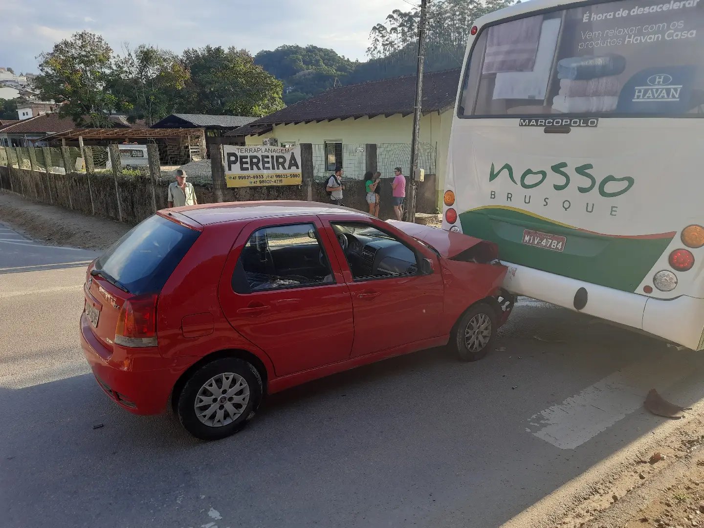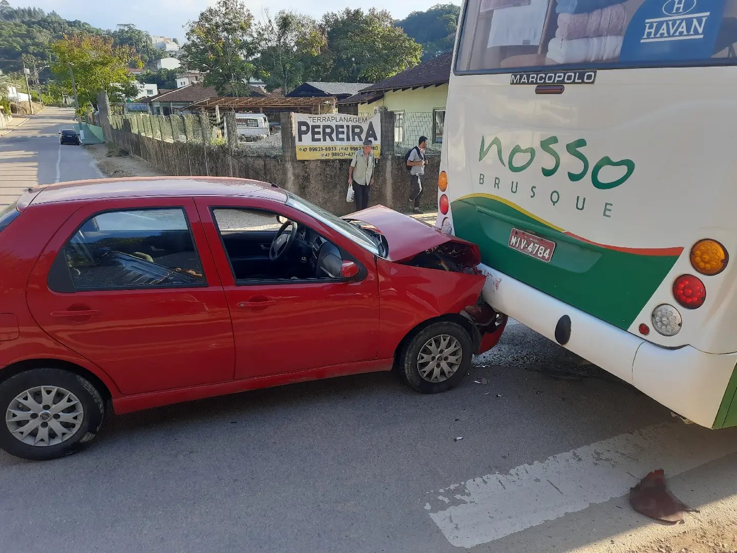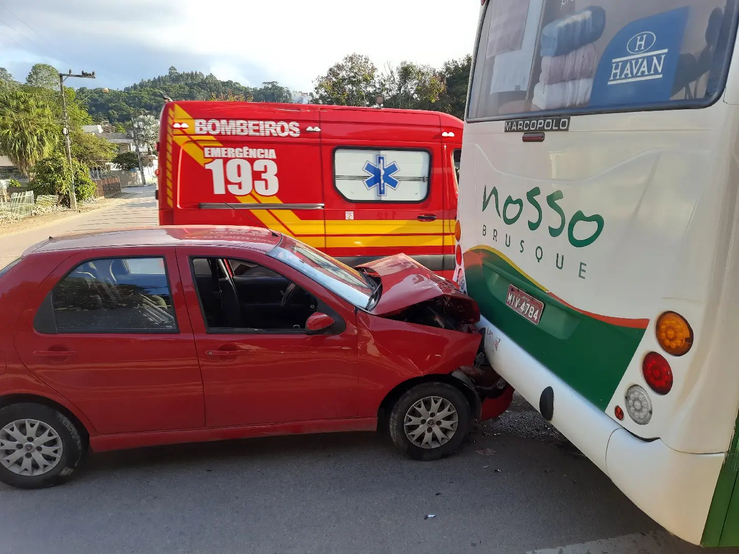 Na tarde desta terça-feira (20), o Corpo de Bombeiros de Brusque foi acionado para atender a uma colisão entre um carro e um ônibus. O acidente ocorreu por volta das 15h36, na rua Poço Fundo.