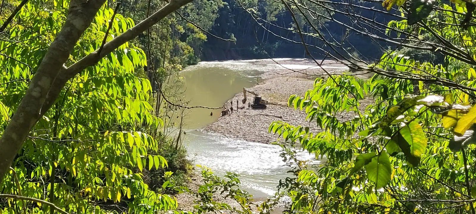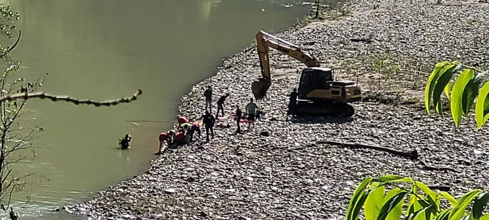 Foi necessária a ajuda de uma máquina retroescavadeira para abrir acesso até o veículo e retirá-lo do rio.