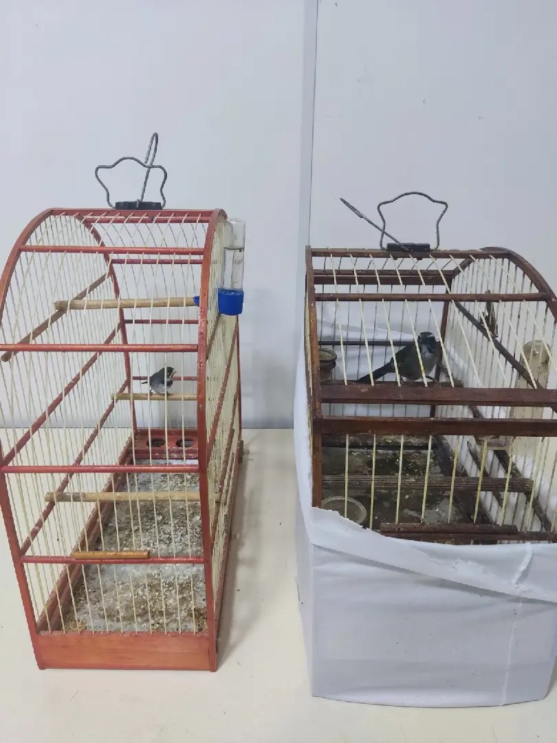 Durante a abordagem, os policiais interrogaram o indivíduo cujas características coincidiam com as descritas nas denúncias. Embora nada de ilícito tenha sido encontrado com ele no momento da abordagem, os agentes se dirigiram à residência do suspeito, onde localizaram, logo na entrada, dois pássaros silvestres em gaiolas e sem anilhas, o que configura crime ambiental.