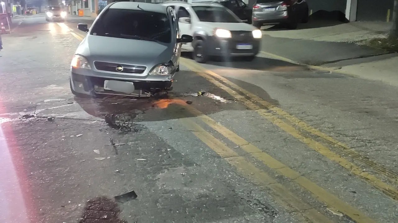 A colisão foi tão forte que o Corsa chegou a rodopiar e perdeu uma das rodas, que acabou atingindo um motociclista que trafegava pela via.