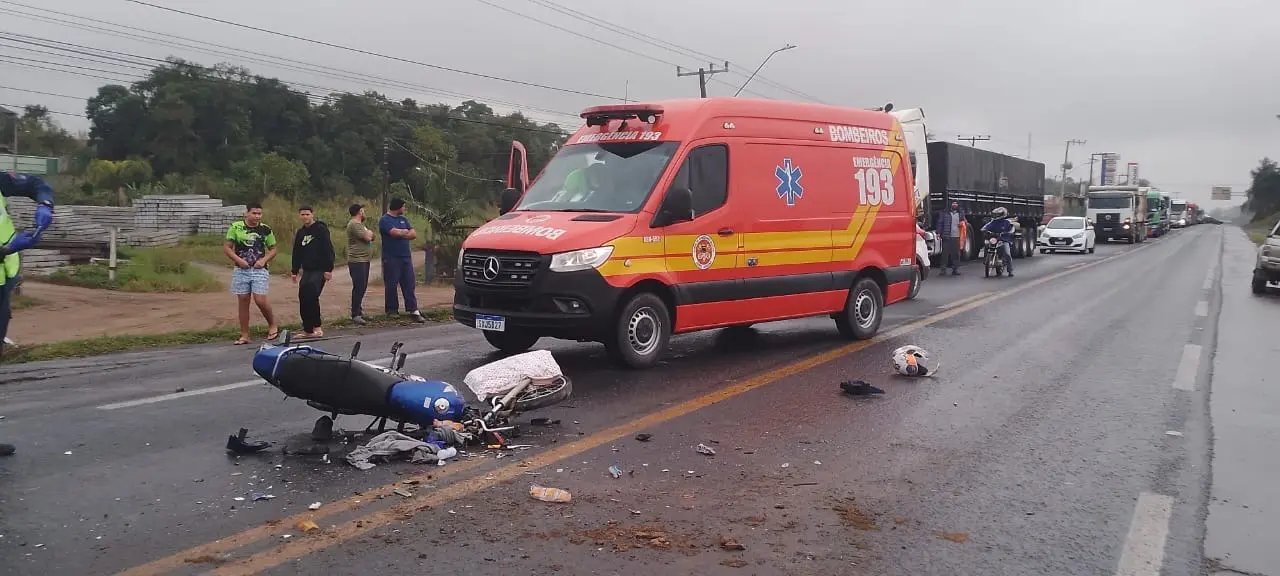 Um casal que estava em uma moto ficou gravemente ferido após se envolver em uma colisão com um carro na tarde desta sexta-feira (25). O acidente aconteceu por volta das 13h, no km 31 da BR-280, no bairro Itinga, em Araquari.
