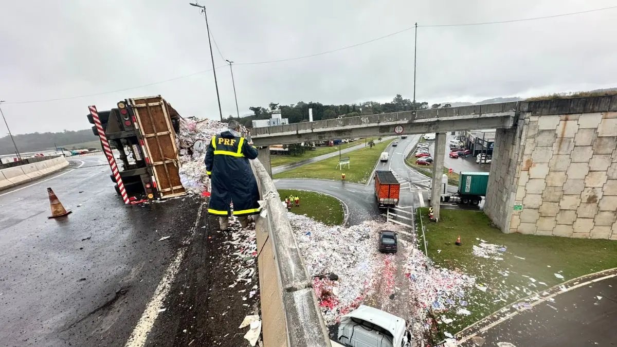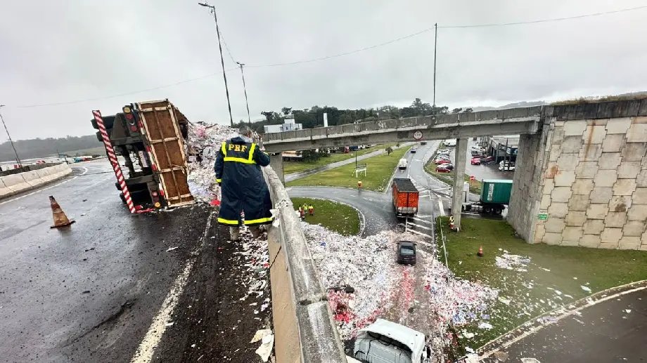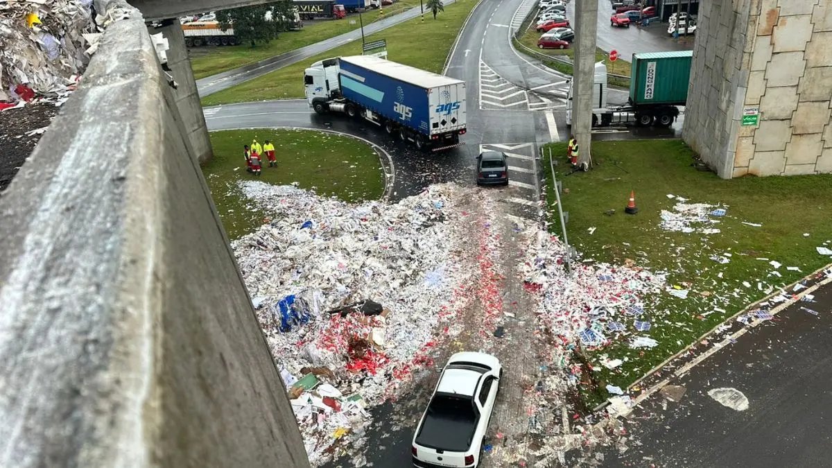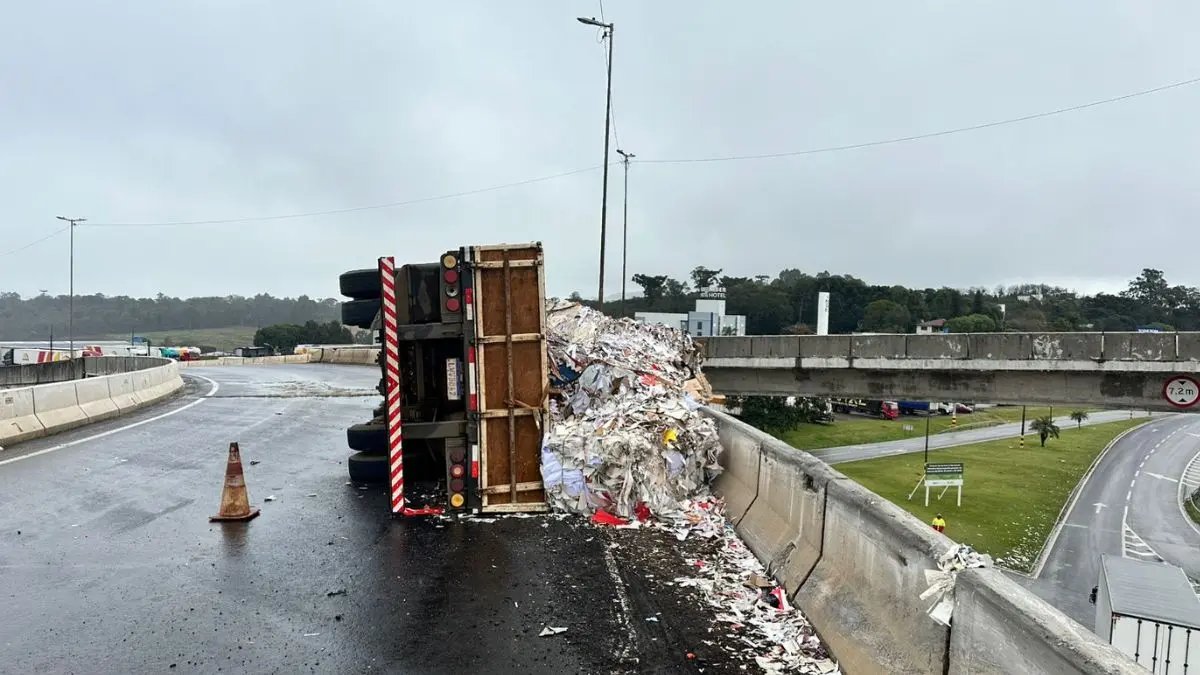Um caminhão que transportava material reciclável tombou por volta das 11h40 desta segunda-feira (28) no viaduto da BR-480, na entrada de Chapecó, no Oeste de Santa Catarina. O acidente comprometeu o trânsito na região e, segundo o policial rodoviário federal Jocelito Novais, ainda não há previsão para liberação da via.